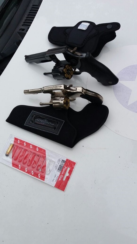 Diante dos fatos, os policiais solicitaram autorização para entrar na residência, sendo autorizados pelo proprietário. Em buscas, eles localizaram um revólver da marca Taurus calibre 38, com seis munições intactas, um revolver calibre importado calibre 32 com cinco munições intactas e uma deflagrada, além de dois coldres, todos escondidos nos fundos da residência.