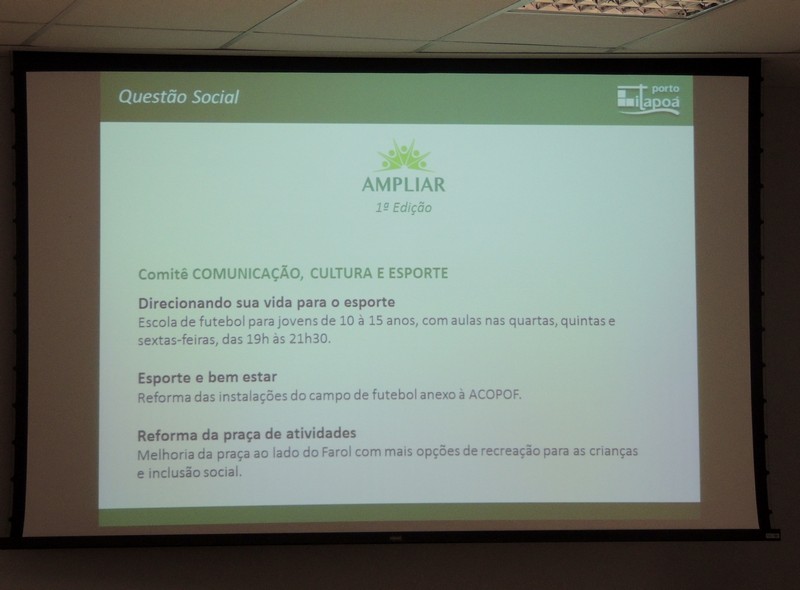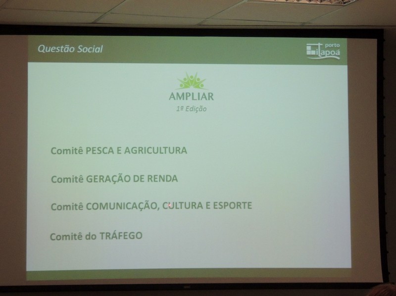 Outro tema abordado foi o Projeto Ampliar, que está em andamento. Trata-se de uma das ações de compensação pelas obras de ampliação do Terminal. Por meio dela, foram criados quatro comitês sobre assuntos de interesse da comunidade e para os quais a própria comunidade propõe projetos. “A intenção é o Porto sair do cenário e tornar a comunidade protagonista”, explicou Alberto Machado.
