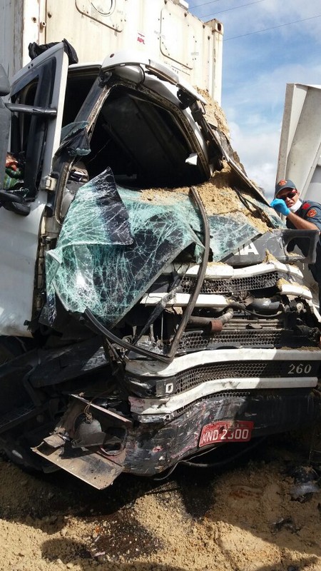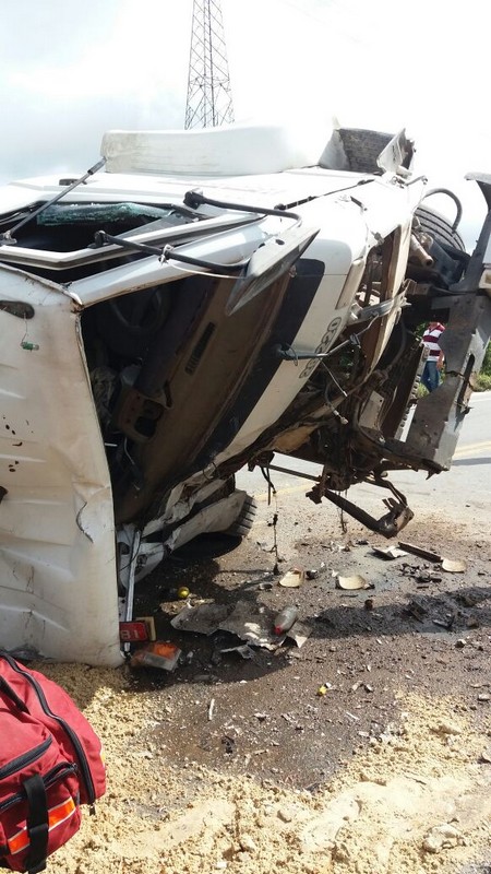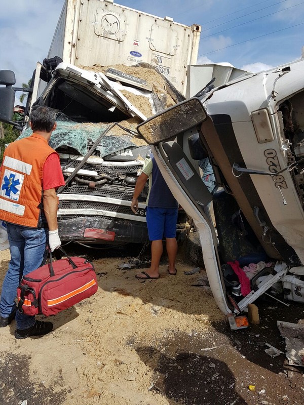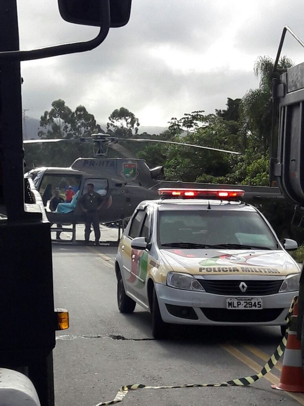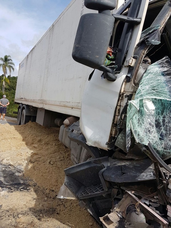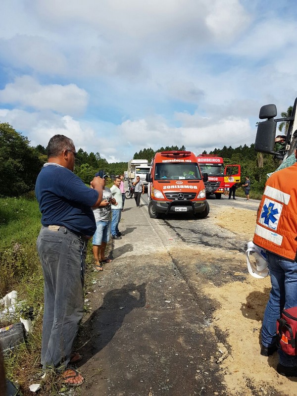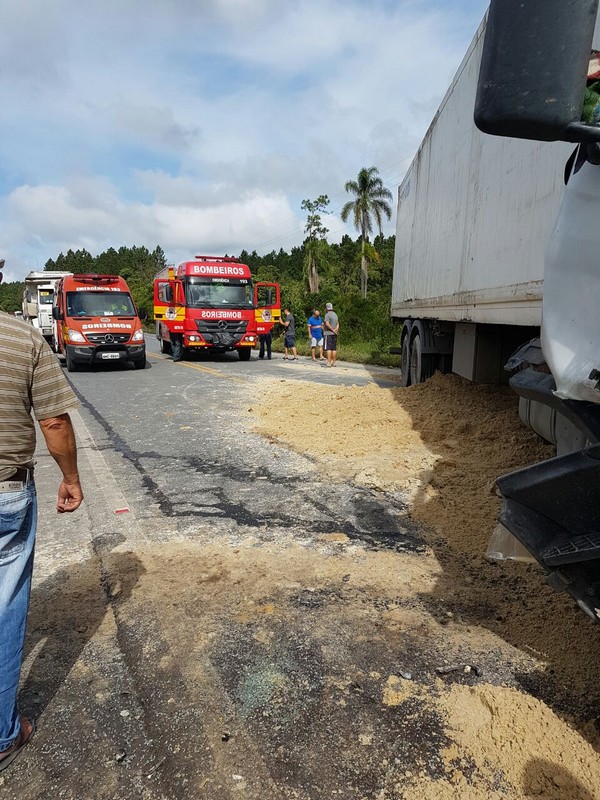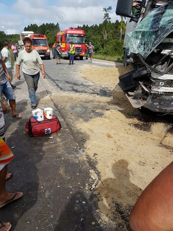 Dois caminhões – um Volkswagen caçamba carregado de areia e uma Scania carreta contêiner – colidiram de frente. O motorista da caçamba, de 51 anos, ficou preso às ferragens. O Corpo de Bombeiros Militar foi acionado para resgatá-lo. Também o helicóptero Águia da Polícia Militar auxiliou no socorro, fazendo o transporte desse caminhoneiro, que se encontrava em estado crítico, ao hospital em Joinville. Inicialmente, informações extraoficiais davam conta de que esse motorista havia entrado em óbito, mas isso não se confirmou por fontes oficiais. Ele estaria passando por uma série de exames para melhor análise de seu caso clínico.