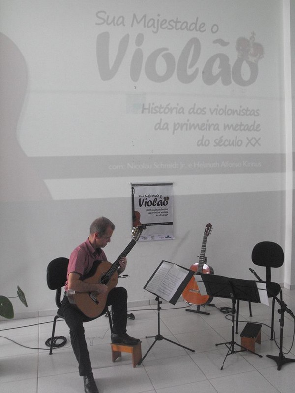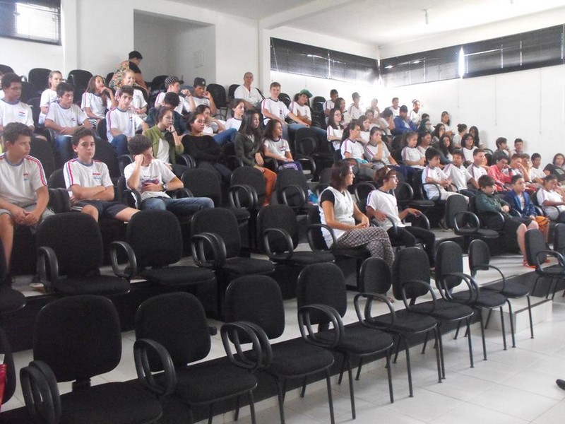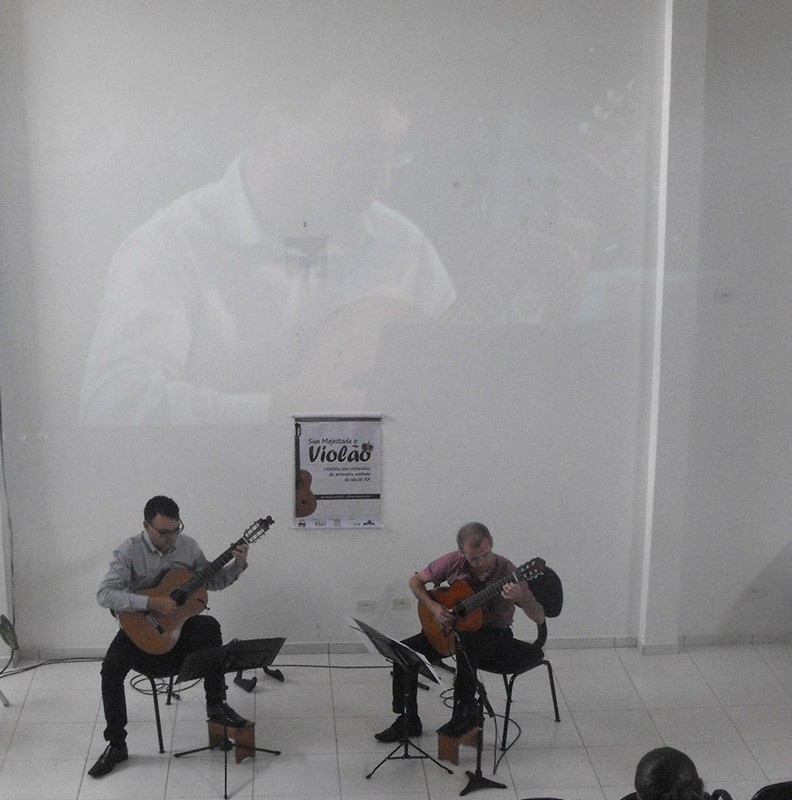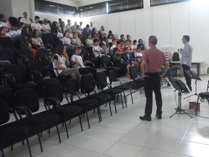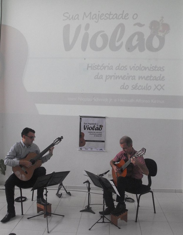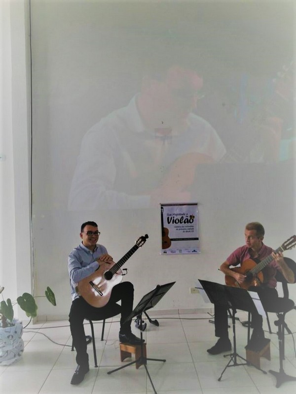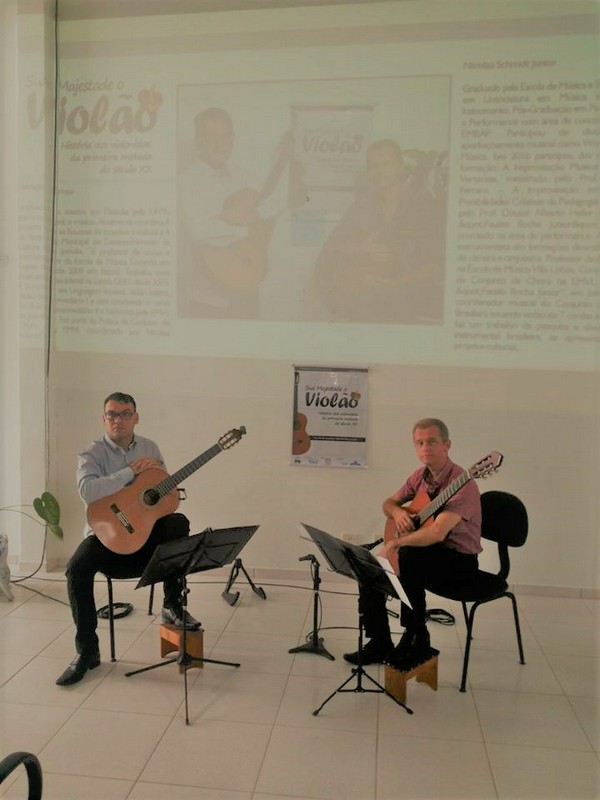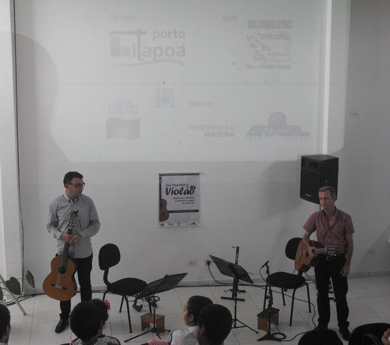 Nesta terça-feira, dia 11 de abril, os alunos do 7º, 8º e 9º ano da Escola Municipal Euclides Emídio da Silva, da Barra do Saí, foram surpreendidos com uma aula diferente. O projeto Sua Majestade o Violão, patrocinado pelo Porto Itapoá via lei Rouanet de incentivo fiscal, contou a história do Brasil através dos violonistas compositores da primeira metade do século XX. “Em uma mistura de sons, cordas, textos, imagens e uma boa prosa, todos passarão a conhecer um pouco mais do Brasil através da música e, assim, iremos juntos nos tornando um pouquinho mais brasileiros”, explica Helmuth Kirinus (o professor Mutti), que juntamente com o professor Nicolau Schmidt Junior, realiza as apresentações do Projeto.
