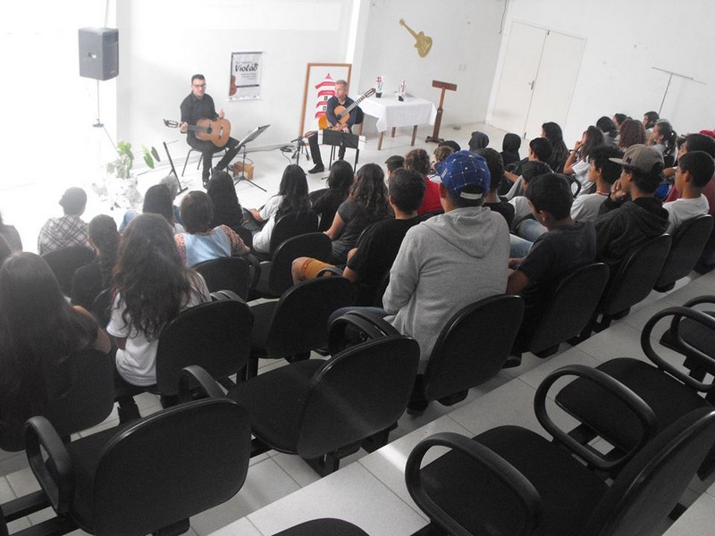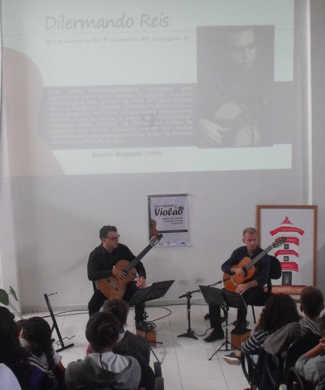 Neste ano de 2017, o violão está indo à escola! O projeto “Sua Majestade, O Violão”, executado via lei Rouanet de incentivo fiscal, pela Escola de Música Tocando em Frente, tem o patrocínio do Porto Itapoá e está contando um pouco da história do violão brasileiro para os estudantes das escolas municipais de Itapoá. Além de apresentar uma ilustração visual dos principais violonistas compositores brasileiros da primeira metade do século XX, o Projeto realiza a execução de uma peça de cada compositor citado, através de solos e duos de violão, interpretados por Nicolau Schmidt e Helmuth Kirinus.