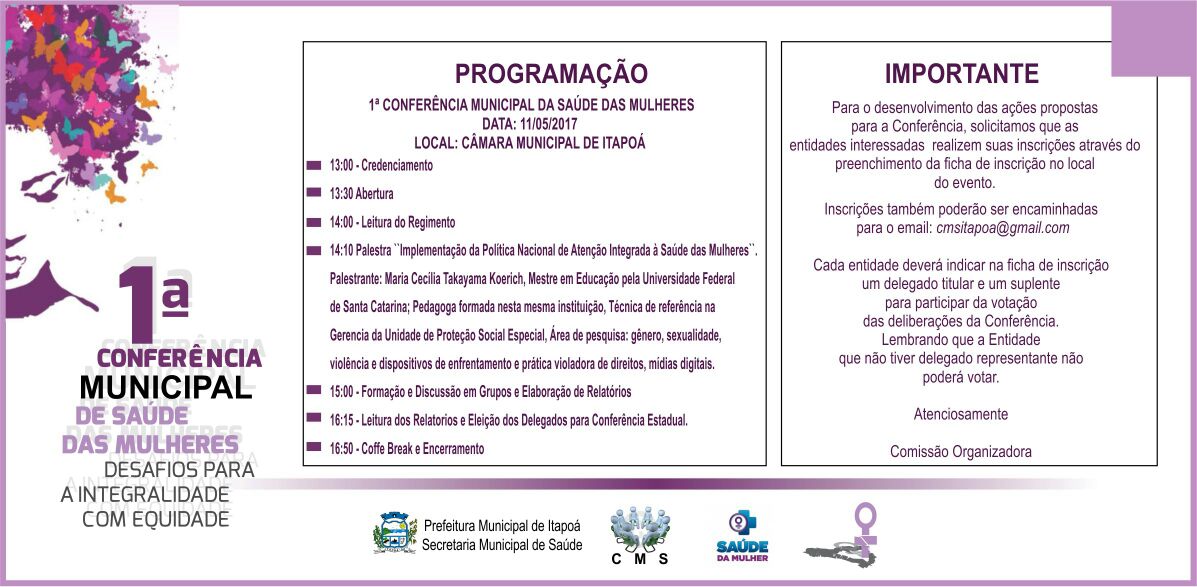 Nesta quinta-feira, dia 11 de maio, será realizada a 1ª Conferência Municipal de Saúde das Mulheres. Com o tema “Desafios para a Integralidade com Equidade”, o evento ocorrerá na sede da Câmara Municipal de Itapoá, localizada à Rua Mariana Michels Borges, 1115, Itapema do Norte, a partir das 13h00min.