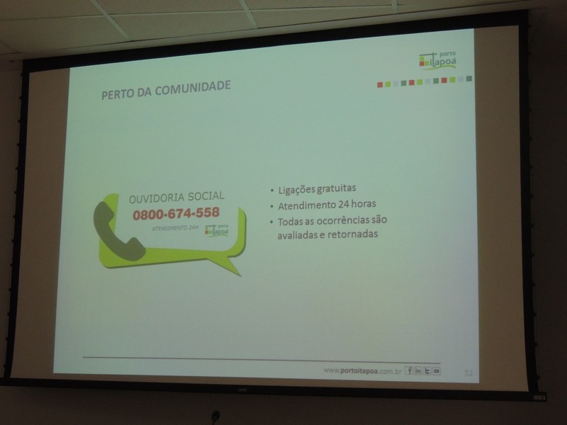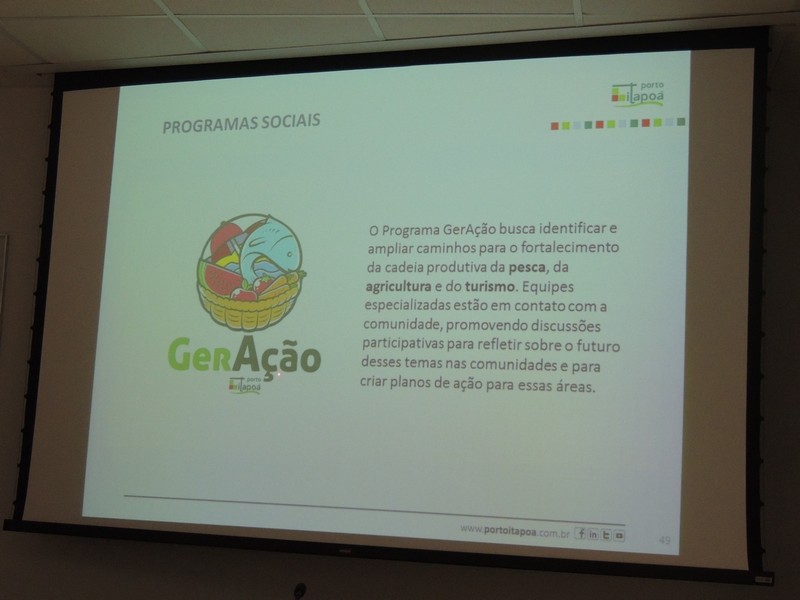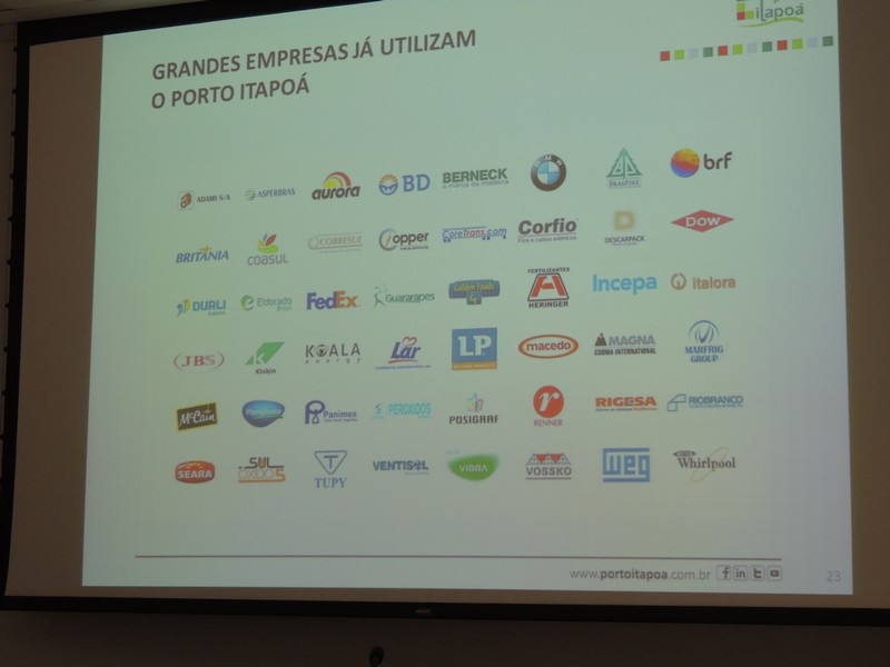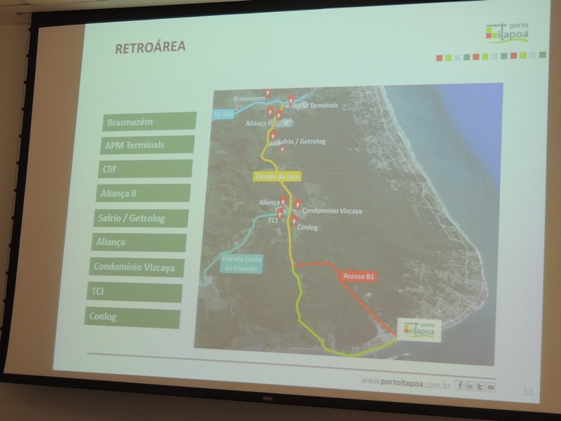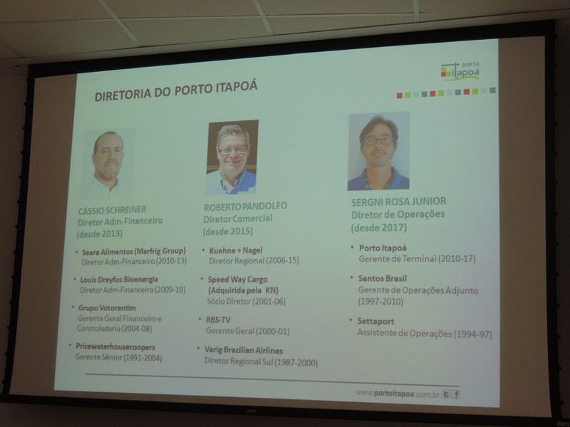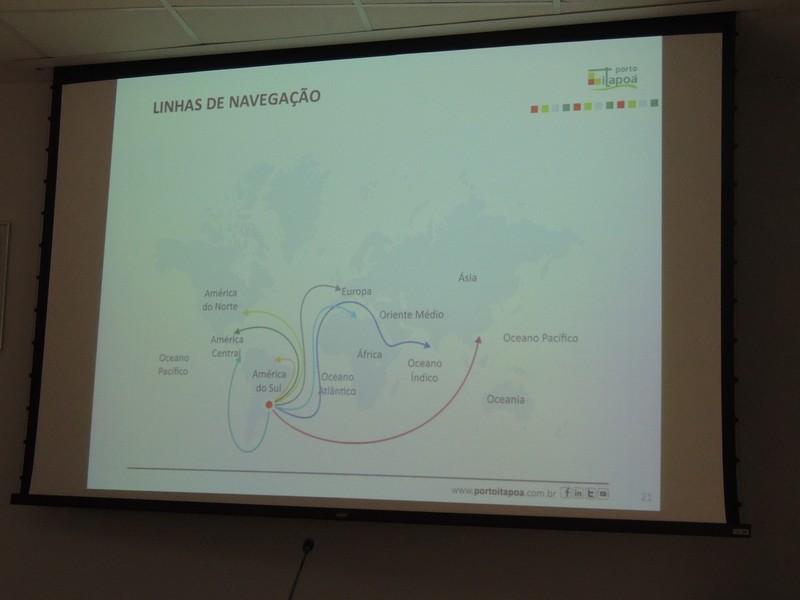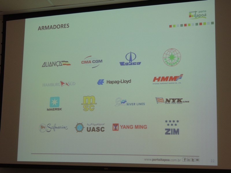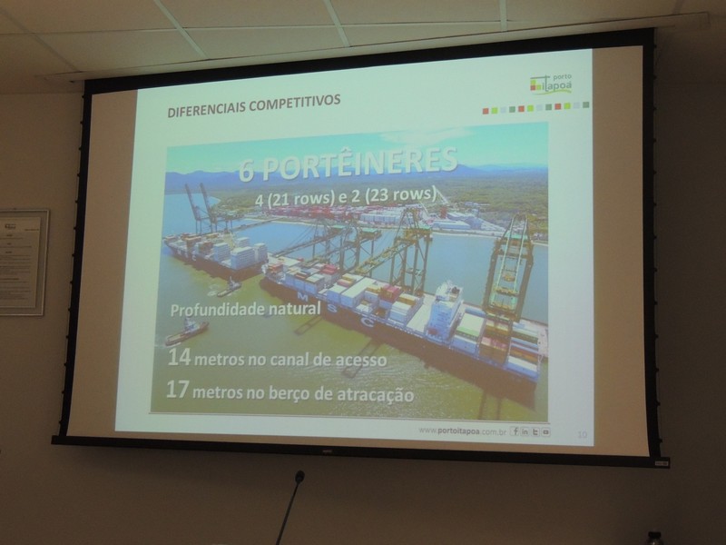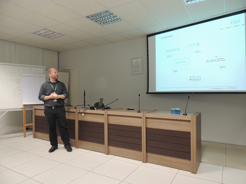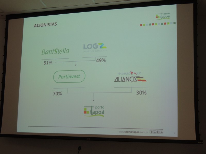 O relações públicas Alberto Machado foi quem conduziu o encontro. Ele iniciou sua explanação, apresentando a composição societária do Porto Itapoá e lembrou que a Aliança Navegação está negociando sua venda á Maersk Line, o que pode resultar numa alteração desse cenário. Isso, porém, não deve interferir na gestão do empreendimento portuário itapoaense, uma vez que a composição majoritária dos acionistas continuará a mesma.
