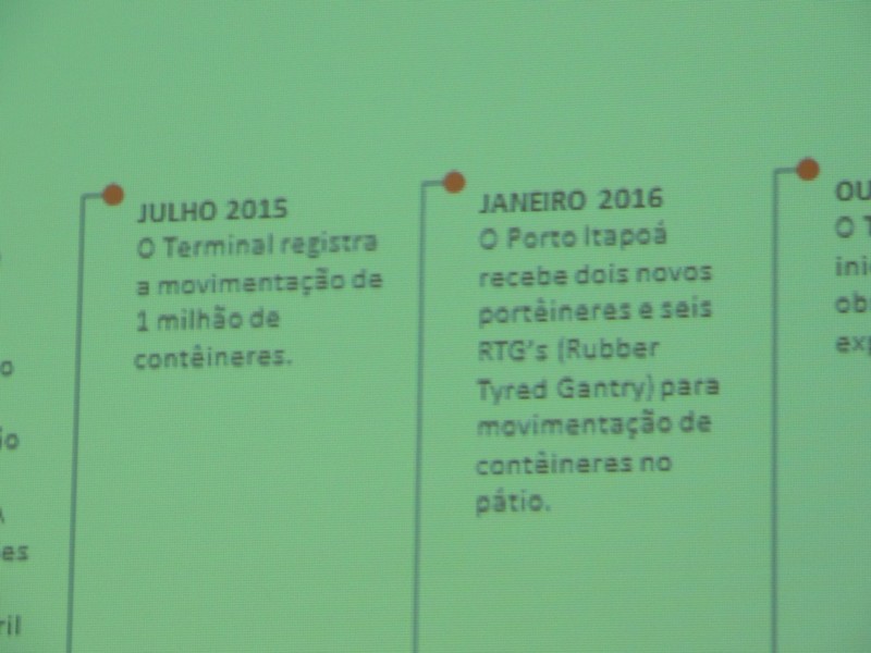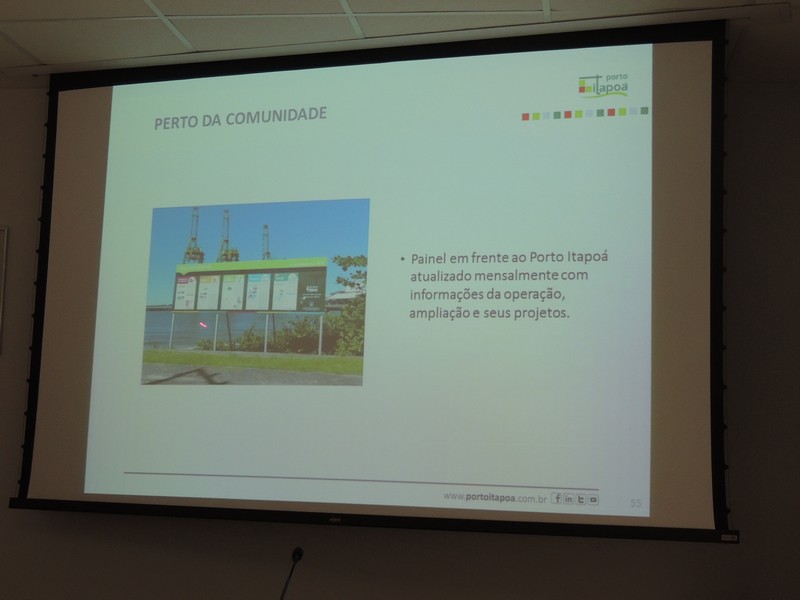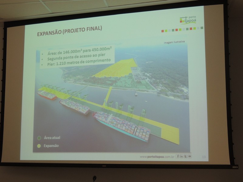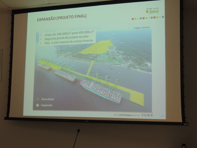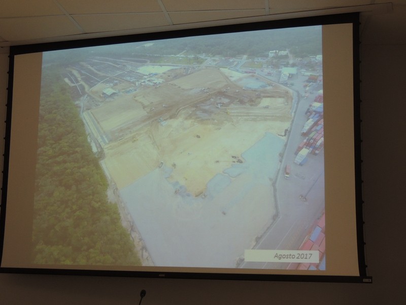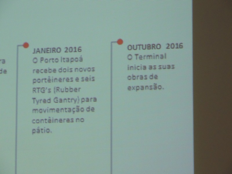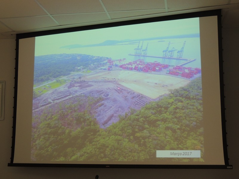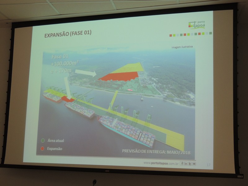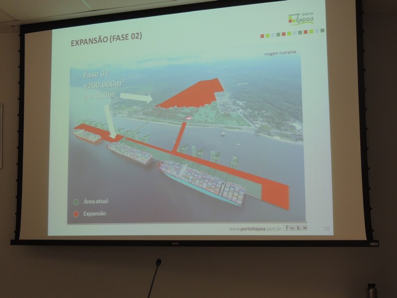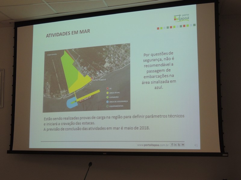 Foram abordados os trabalhos realizados na obra de ampliação do Terminal até aqui. Segundo o Porto Itapoá, essa ampliação conta com muitas empresas e pessoal local em suas obras. Por fim, Alberto Machado mostrou, através de fotos, a evolução da obra de ampliação do Porto Itapoá, bem como os projetos sociais e de comunicação desenvolvidos pelo Terminal.