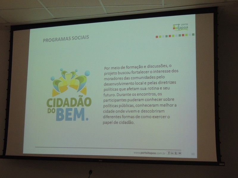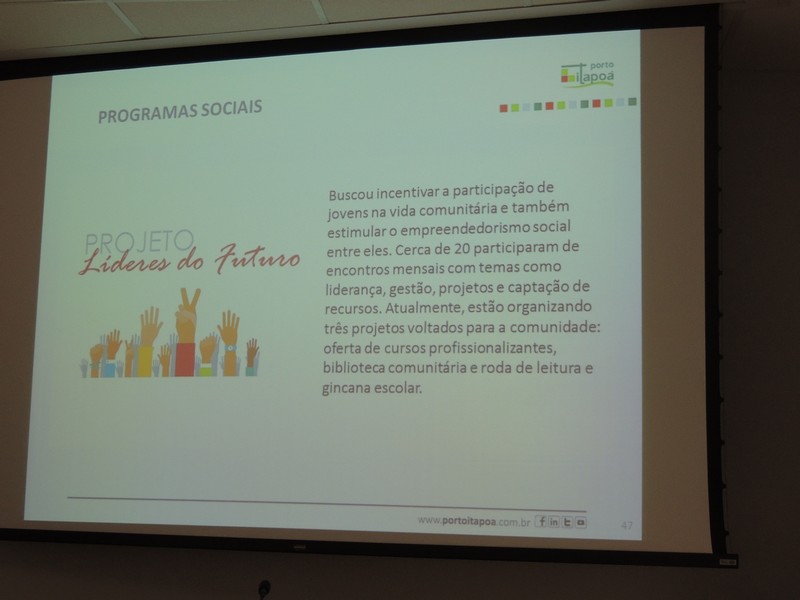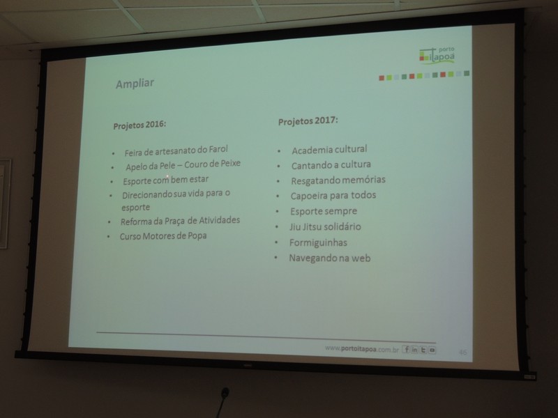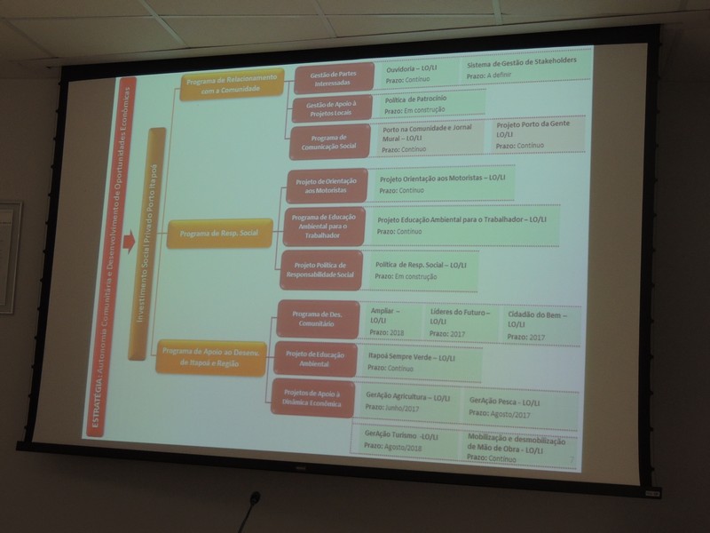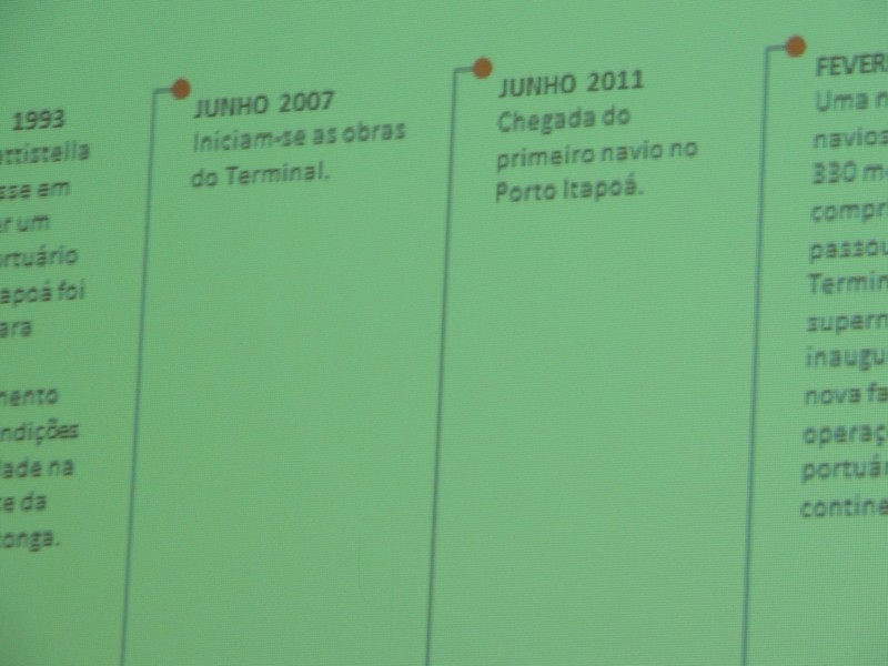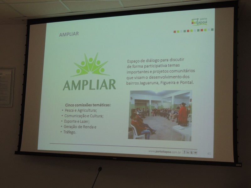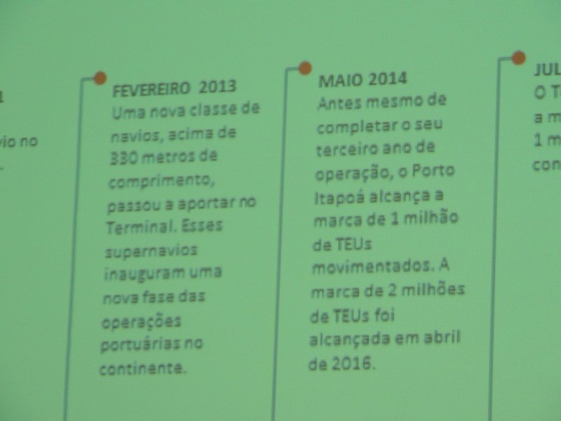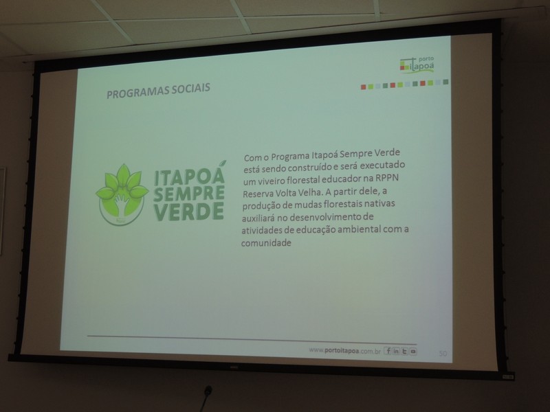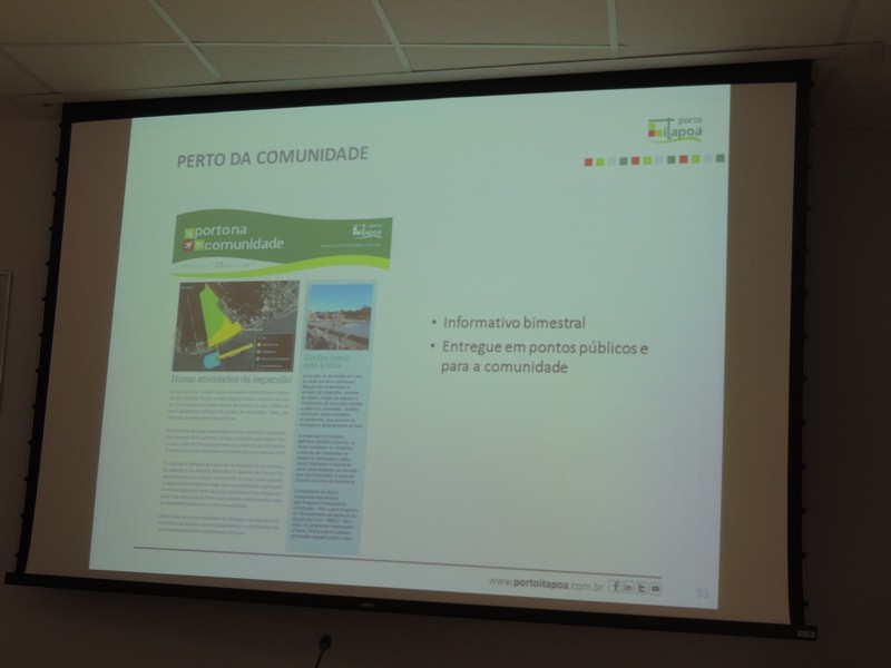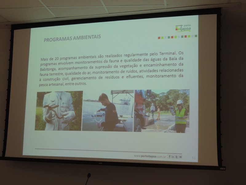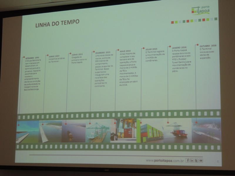 Foram abordados os trabalhos realizados na obra de ampliação do Terminal até aqui. Segundo o Porto Itapoá, essa ampliação conta com muitas empresas e pessoal local em suas obras. Por fim, Alberto Machado mostrou, através de fotos, a evolução da obra de ampliação do Porto Itapoá, bem como os projetos sociais e de comunicação desenvolvidos pelo Terminal.