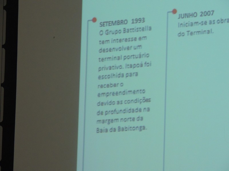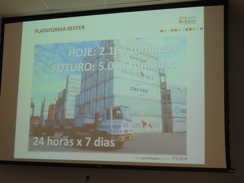 Em seguida, Alberto comentou a evolução do Porto a partir dos anos e, em especial, focou a comparação entre a estrutura atual do Porto e aquela que se pretende atingir após a ampliação do Terminal. O relações públicas também citou os diferenciais competitivos do Porto Itapoá e a melhor infraestrutura que o empreendimento poderá ofertar após sua ampliação, o que contempla não só um grande aumento de capacidade, como o aumento de reefers (tomadas) por exemplo, o que pode determinar a vinda de um armazém frigorífico a Itapoá, investimento “limpo” (sem danos ambientais) e que tende a gerar muitas vagas de emprego. Provavelmente, Garuva também concorreria como possível cidade sede desse tipo de empreendimento. Nesse sentido, o Terminal conta com o apoio da Prefeitura local, para que a Cidade seja atrativa à vinda desse tipo de empresa.