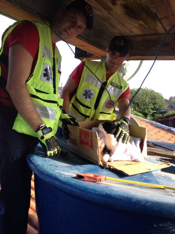 Por volta das 07h30min desta quinta-feira, dia 1º de março, o Corpo de Bombeiros Militar de Itapoá foi acionado para resgatar uma gata que havia se acidentado em cima de um muro com cerca de três metros de altura no bairro Samambaial, próximo à Delegacia da Polícia Civil local. A felina estava com um vergalhão de construção encravada em seu abdômen. Após o resgate, ela foi estabilizada e deixada aos cuidados de seu responsável.