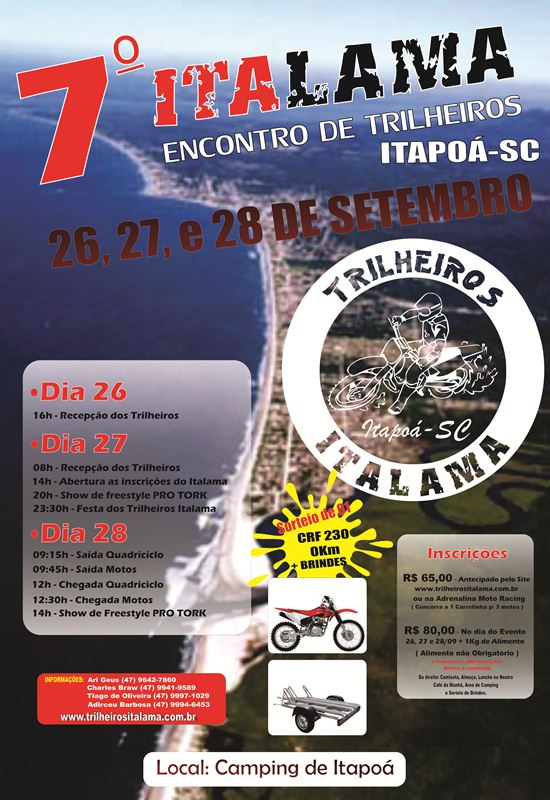 Será nos próximos dias 26, 27 e 28 de setembro (sexta, sábado e domingo), a realização do 7º Encontro de Trilheiros Italama, em Itapoá. A concentração do evento ocorrerá no Camping de Itapoá. As inscrições custam R$ 65 para pagamento antecipado, sendo que no dia será cobrado R$80 acrescido de um quilo de alimento (este, não obrigatório). Haverá o sorteio de uma moto Honda CRF 230 zero km e uma carretinha para três motos entre todos os que fizerem a inscrição para o evento antecipadamente.