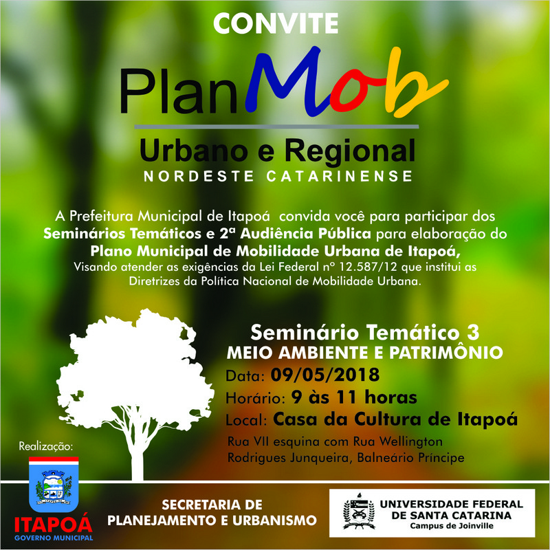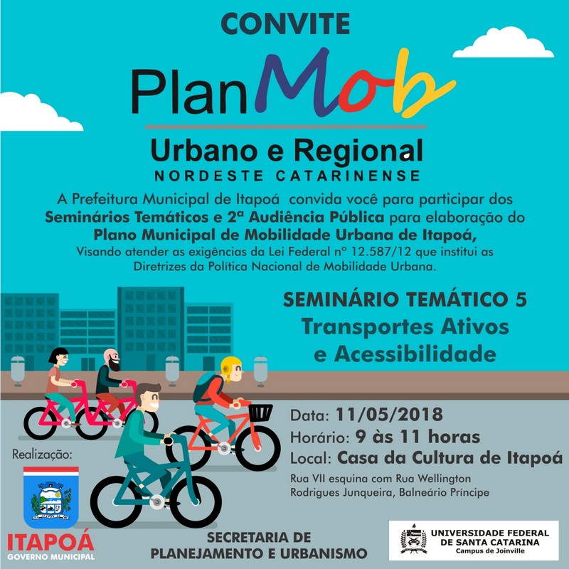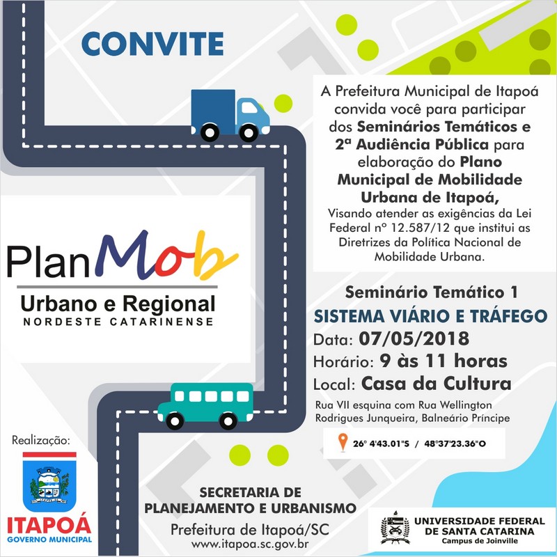 Está marcado para esta segunda-feira, dia 7 de maio, o início de uma jornada para revisão e discussão do desenvolvimento de Itapoá, tendo como objetivo final, a elaboração do Plano Municipal de Mobilidade Urbana. A Prefeitura de Itapoá convida todos a participar dos seminários temáticos e, posteriormente, da Audiência Pública (a segunda), como exige a Lei Federal 12.587/12, que institui as Diretrizes da Política Nacional de Mobilidade Urbana.