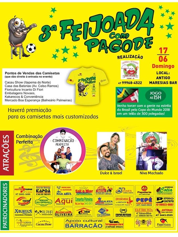 A 3ª Feijoada com Pagode é uma promoção da Choperia e Petiscaria Toca do Siri e conta com o apoio dos seguintes patrocinadores: Master Farma; Casa das Baterias Itapoá; Mercado e Açougue Mar Azul; Supermercado Sol e Mar; Mania de Pizza; Novaes Embalagens; Papelaria A4; Supermercado Cotia; Central de Cargas Itapoá; Mercado Boa Esperança; Informativo Aqui Itapoá; Consertos Palmeiras; Realeza Materiais de Construção; Explosão Modas; Pepê Aluguel de Brinquedos; Binho Construtor; Kakarekos Conveniência e Variedades; Alpha Empreendimentos Imobiliários; Alencar R. Oliveira Corretor de Imóveis; Cida Calvo Corretora de Imóveis; Itapoá FM; Itapoá Notícias; Eletricista Cláudio; SDZ Antenas; Consultório Odontológico Dr. Antonio Pizzamiglio Neto; Cacau Show; Vereador Barracão; Terraplanagem Litoral; Floricultura Incanto Di Fiori; e Fisiopilates.
