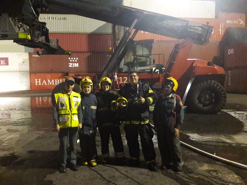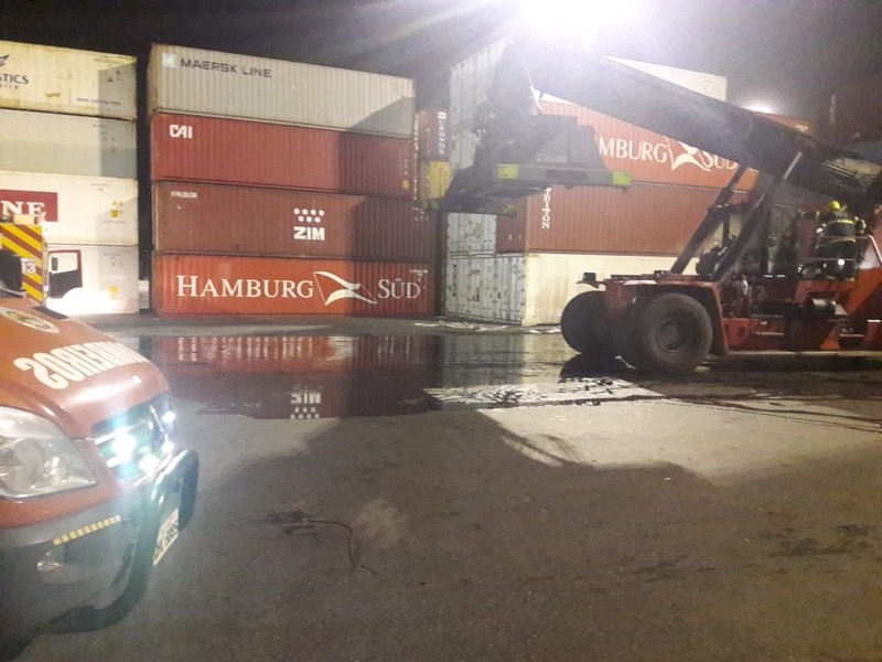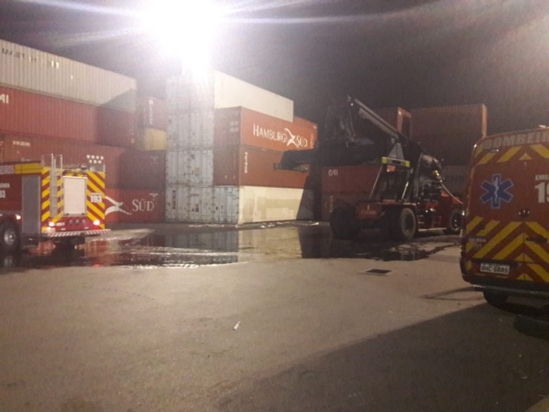 No local, os bombeiros encontraram a equipe de brigadistas da empresa iniciando o combate às chamas em uma empilhadeira Stacker (empilhadeira de alcance), utilizada para manusear contêineres de carga.