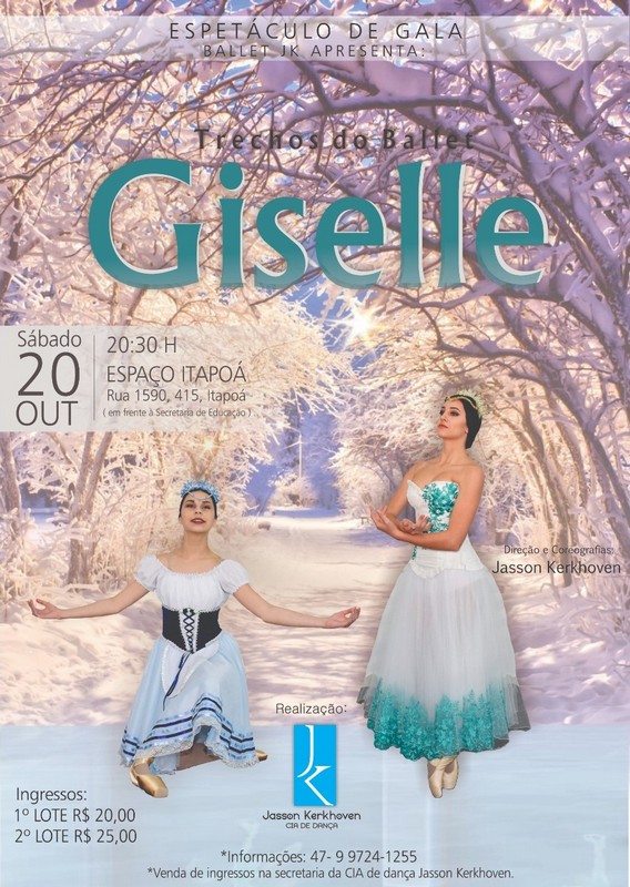 A Cia de Dança Jasson Kerkhoven realizará a estreia de sua nova montagem neste sábado, dia 20 de outubro, às 20h30 no Espaço Itapoá (rua 1590, nº 415, Itapoá Centro – em frente à Secretaria Municipal de Educação). A peça será o espetáculo de gala com Trechos do Ballet Giselle. “Convidamos você, sua família e seus amigos para prestigiar esse espetáculo que conta com mais de 40 profissionais envolvidos além de mais de 30 figurinos em cena”, divulgou a Cia de Dança. Além disso, haverá a presença de bailarinos convidados para compor esse grande espetáculo, como a bailarina Fernanda Honorata, formada pela Escola do Teatro Bolshoi no Brasil.