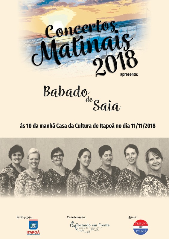 No próximo domingo, dia 11 de novembro, às 10h, a Casa da Cultura de Itapoá sediará mais uma edição do Concerto Matinal, que traz mensalmente uma apresentação musical para a Cidade. Dessa vez, o público presente será agraciado por uma apresentação do grupo vocal Babado de Saia, que atualmente é formado por sete vozes femininas, que representam as mulheres nos vários setores da sociedade. O repertório apresenta um caráter popular e folclórico.