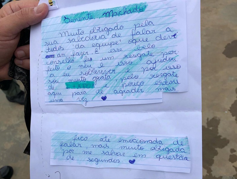 No encontro com os seus heróis, Anabelly entregou uma cartinha escrita à mão e chocolates aos policiais. “Tenente Machado. Muito obrigado pela sua sabedoria de falar a todos da equipe o que deveriam fazer. Esse belo conselho fez um resgate perfeito, o meu. Isso me ajudou a sobreviver e, por isso, sou muito grata, pelo resgate de Itapoá. Por isso, estou aqui para te agradecer mais uma vez”, escreveu na cartinha direcionada ao tenente-coronel Alessandro Machado, comandante da 2ª Companhia de Aviação da Polícia Militar de Santa Catarina.