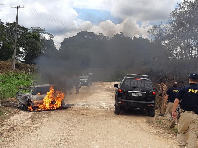 A ocorrência é atendida pela PRF (Polícia Rodoviária Federal), que conta com o apoio das polícias rodoviárias estaduais do Paraná e de Santa Catarina, da RONE (Rondas Ostensivas de Natureza Especial) da PM do Paraná e helicóptero da Polícia Militar paranaense. Alguns bloqueios chegaram a ser realizados nas divisas dos estados do Paraná e Santa Catarina, mas as buscas pelos assaltantes continuavam até o fechamento desta matéria.