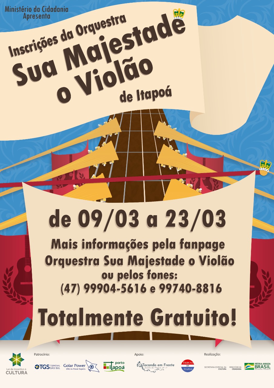 Dois projetos culturais realizados pelo Governo Federal via Lei de Incentivo Fiscal à Cultura (antiga Lei Rouanet), com o patrocínio da TGS, Golar Power e do Porto Itapoá, por intermédio da Escola de Música Tocando em Frente estão ofertando aulas gratuitas de violão em Itapoá. Para ambos os projetos, as inscrições vão até o próximo dia 23 de março e devem ser realizadas diretamente com a Escola de Música, pelo telefone (com WhatsApp) (47) 99904-5616 ou (47) 99740-8816.