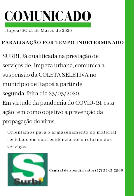 Em nota divulgada neste sábado, dia 21 de março, a Surbi, empresa responsável pela coleta de lixo em Itapoá, informa que a coleta seletiva (referente aos recicláveis) será suspensa a partir desta segunda-feira, dia 23 de março. A ação é em função da pandemia do Covid-19 e tem como objetivo prevenir a propagação do vírus. “Orientamos para o armazenamento do material reciclado em sua residência até o retorno dos serviços”, divulgou a empresa.