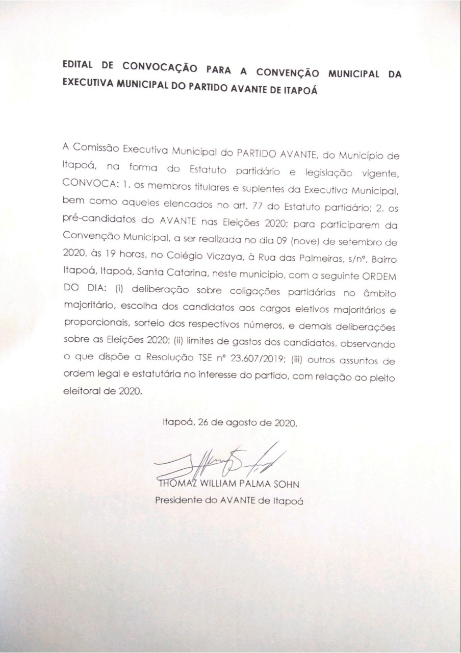 A Comissão Executiva Municipal do PARTIDO AVANTE, do Município de Itapoá, na forma do Estatuto partidário e legislação vigente, CONVOCA: 1. os membros titulares e suplentes da Executiva Municipal, bem como aqueles elencados no art. 77 do Estatuto partidário; 2. os pré-candidatos do PARTIDO AVANTE nas Eleições 2020; para participarem da Convenção Municipal, a ser realizada no dia 09 (nove) de setembro de 2020, às 19 horas, no Colégio Vizcaya, à Rua das Palmeiras, s/nº, Bairro Itapoá, Itapoá, Santa Catarina, neste município, com a seguinte ORDEM DO DIA: (i) deliberação sobre coligações partidárias no âmbito majoritário, escolha dos candidatos aos cargos eletivos majoritários e proporcionais, sorteio dos respectivos números, e demais deliberações sobre as Eleições 2020; (ii) limites de gastos dos candidatos, observando o que dispõe a Resolução TSE nº 23.607/2019; (iii) outros assuntos de ordem legal e estatutária no interesse do partido, com relação ao pleito eleitoral de 2020.