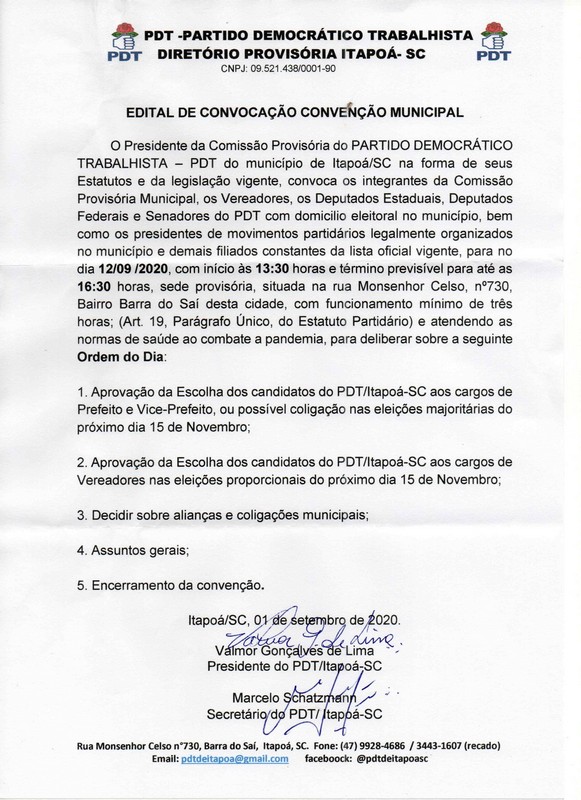 O Presidente da Comissão Provisória do Partido Democrático Trabalhista – PDT do município de Itapoá/SC na forma de seus Estatutos e da legislação vigente, convoca os integrantes da Comissão Provisória Municipal, os Vereadores e os Deputados Estaduais, Deputados Federais e Senadores do PDT com domicílio eleitoral no município, bem como os presidentes de movimentos partidários legalmente organizados no município e demais filiados constantes na lista oficial vigente, para no dia 12/09/2020, com início às 13:30 horas e término previsível para até as 16:30 horas, sede provisória, situada na rua Monsenhor Celso, nº 730, Bairro Barra do Saí desta cidade, com funcionamento mínimo de três horas; (Art. 19, Parágrafo Único, do Estatuto Partidário) e atendendo as normas de saúde ao combate a pandemia, para deliberar sobre a seguinte Ordem do Dia: