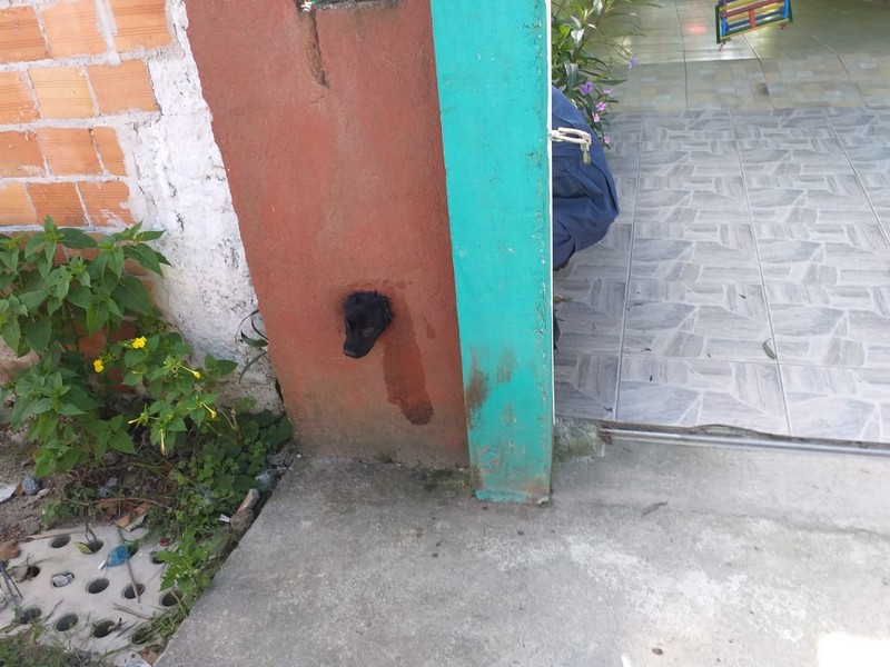 No local, foi constatado que o cão havia se prendido pela cabeça em um buraco do muro.
