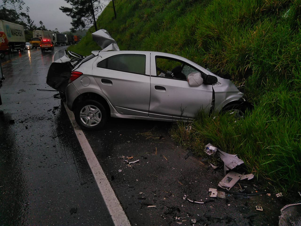 No local, foi constatado que se tratava de uma colisão frontal envolvendo um automóvel GM Onix e um caminhão de transporte de contêiner.