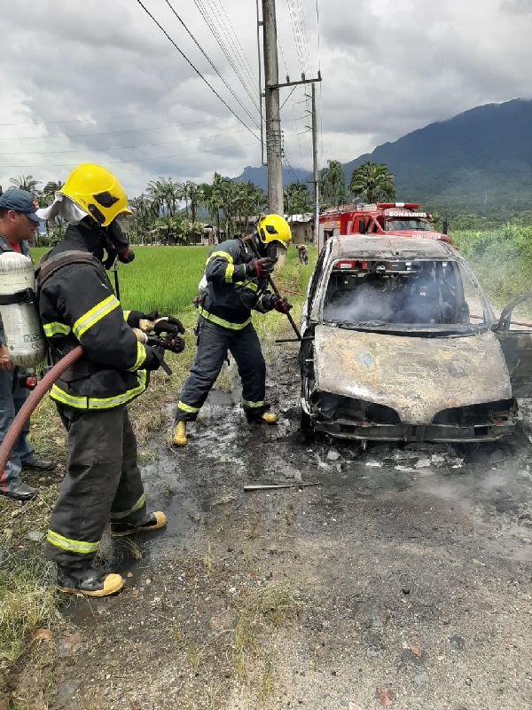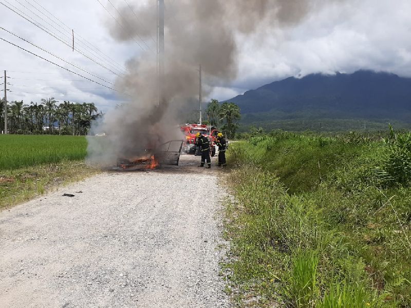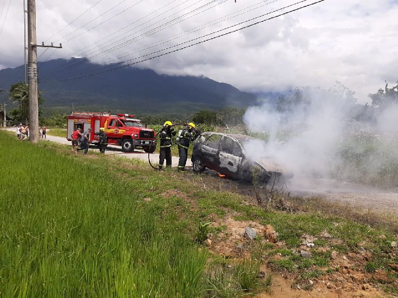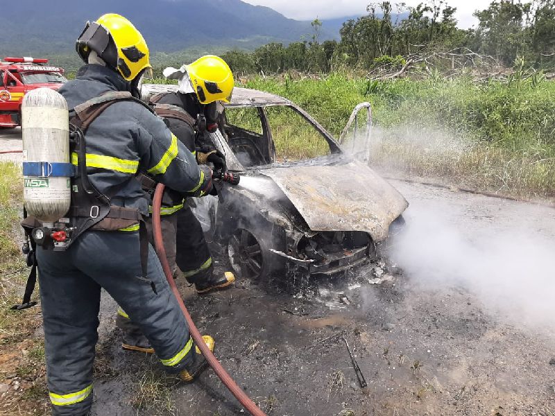 Ao chegarem no local, os bombeiros verificaram que o veículo estava estacionado em uma estrada de chão, paralelo ao acostamento da via. O carro, um Renault Scenic de cor bordô e placas de Garuva, já se encontrava completamente tomado pelas chamas.