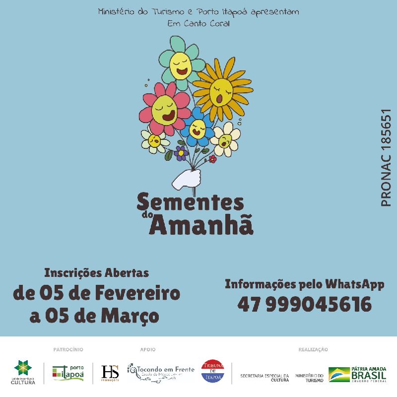 A Escola de Música Tocando em Frente, através de projetos culturais via lei de incentivo fiscal federal, renova as inscrições para quatro projetos de formação musical continuada. São eles: o projeto Violão para Todos para iniciantes no instrumento; Orquestra Sua Majestade o violão, para estudantes já iniciados no instrumento e na leitura musical; coral infantil Sementes do Amanhã, para qualquer criança a partir de 8 anos com desejo de cantar; e coral adulto Vozes da Babitonga para qualquer munícipe disposto a aprender ou aperfeiçoar sua expressão artística através do canto.