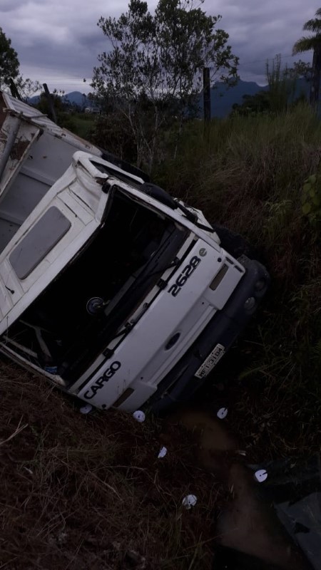 No local, estava o caminhão Ford Cargo 2628e de cor branca e placas de Joinville tombado na ribanceira. O motorista, um homem de 53 anos, encontrava-se sentado no interior da cabine, próximo ao para-brisa, consciente, mas desorientado, com suspeita de fratura nas costas, contusão e escoriações na face, além de sangramentos pelo rosto. Ele foi socorrido e encaminhado à UPA (Unidade de Pronto Atendimento) para avaliação médica.
