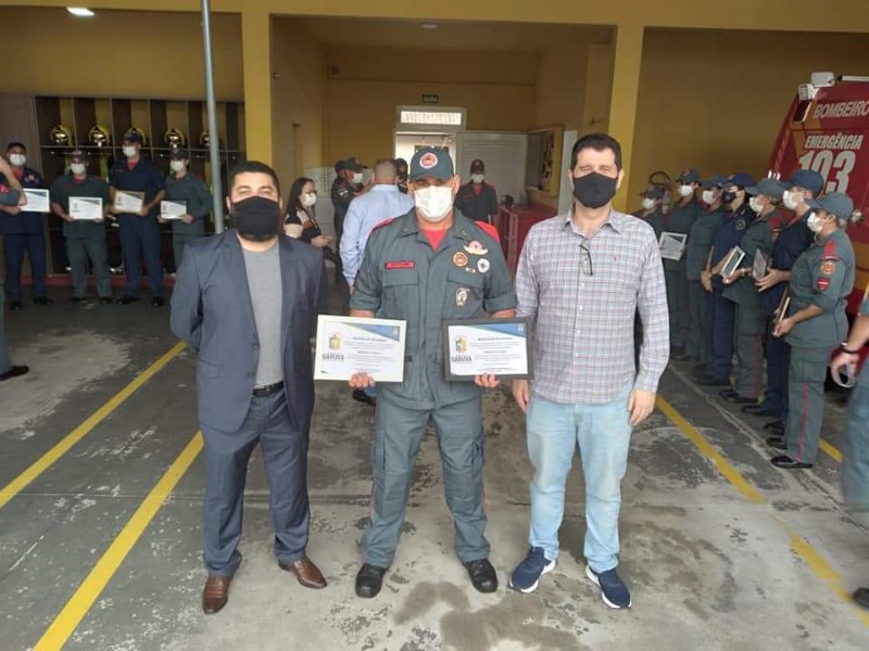 A solenidade iniciou com a entrega de moção de aplausos indicada pelos vereadores Jarbas Budal e vereador Edson Jair Back, a bombeiros militares e comunitários por ocorrências de vulto que atenderam, destacando individualmente os bombeiros pelos relevantes serviços prestados ao município de Garuva e pelos atos de bravura e atitudes que os levaram a concluir sua missão com êxito.