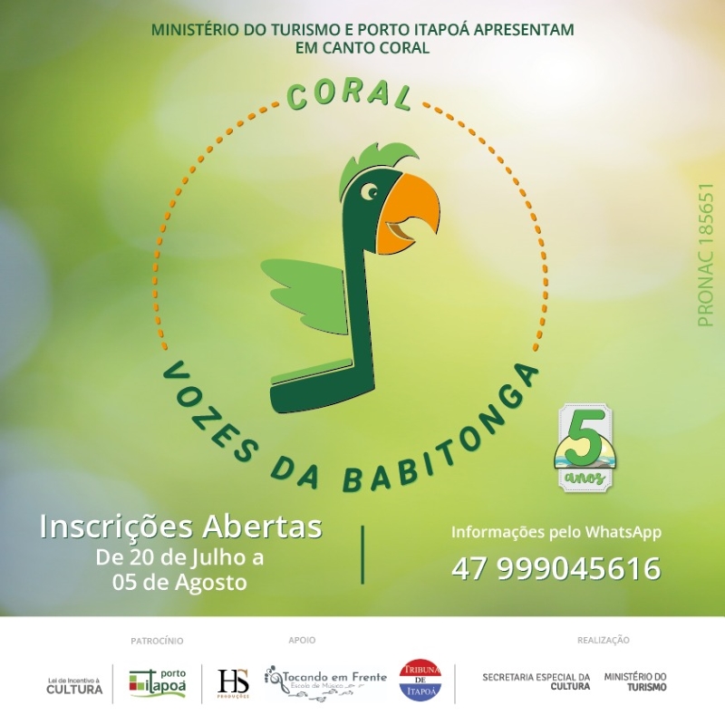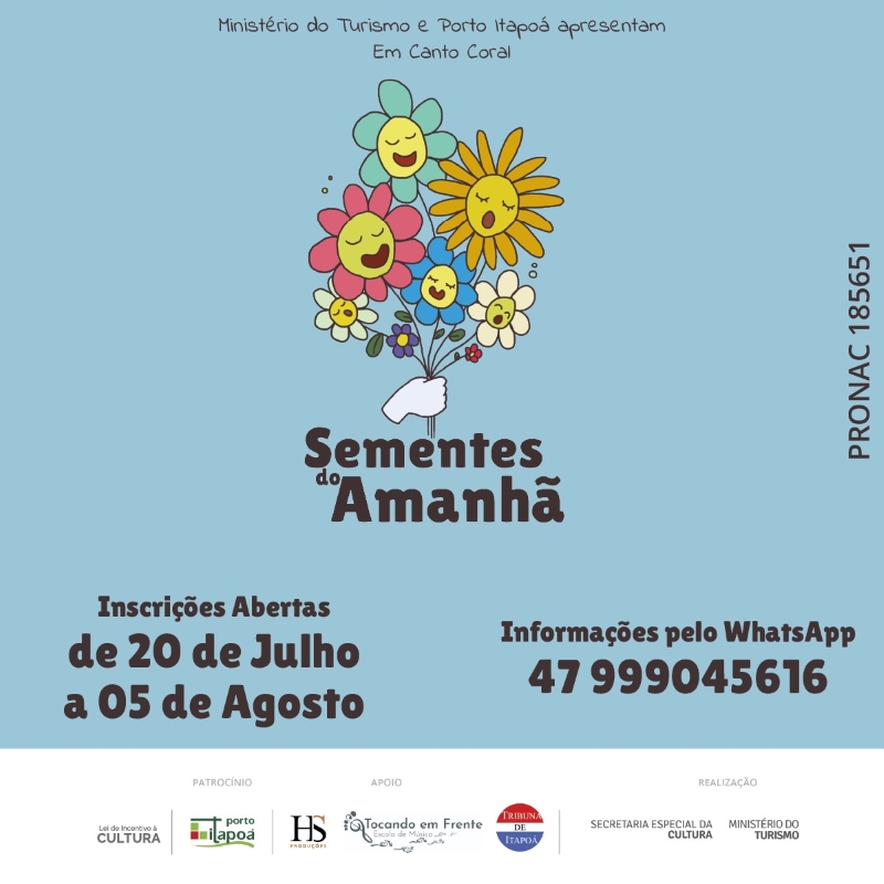 Até o próximo dia 05 de agosto, a Escola de Música Tocando em Frente estará recebendo as inscrições de novos coristas para os corais adulto Vozes da Babitonga e infantil Sementes do Amanhã. As entrevistas que integram o processo seletivo para as vagas ocorrerão em local, dia e horário a serem agendados.