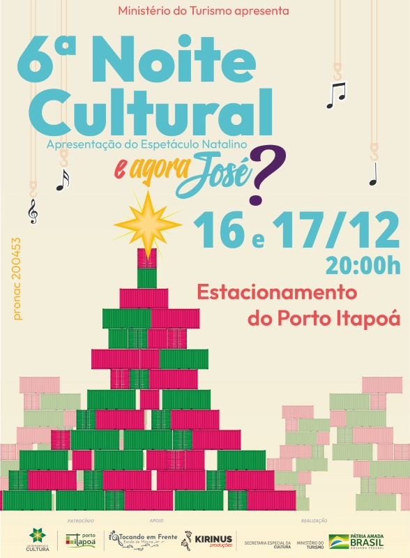 A tradicional Noite Cultural promovida pelo Porto Itapoá retorna neste ano de 2022 após ter sido interrompida durante a pandemia por Covid-19. Em sua sexta edição, e já tradicional no calendário de eventos do município, a Noite Cultural do Porto Itapoá terá espetáculos em duas datas, dias 16 e 17 de dezembro, sempre às 20 horas, no palco que está sendo montado no estacionamento do Terminal.