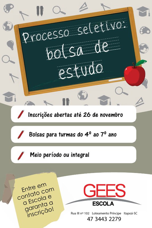 folder - bolsa de estudo Escola GEES em ItapoáSegundo divulgado pela sua Assessoria de Comunicação, a Escola Particular GEES, em Itapoá, está com as inscrições abertas para o processo seletivo de bolsas de estudo parciais voltadas a alunos novos do 4º ao 7º ano. A seleção se dará por intermédio de uma prova desenvolvida pela equipe pedagógica da instituição.