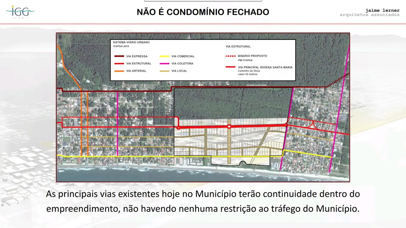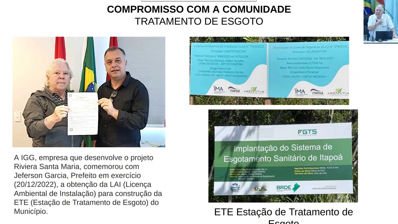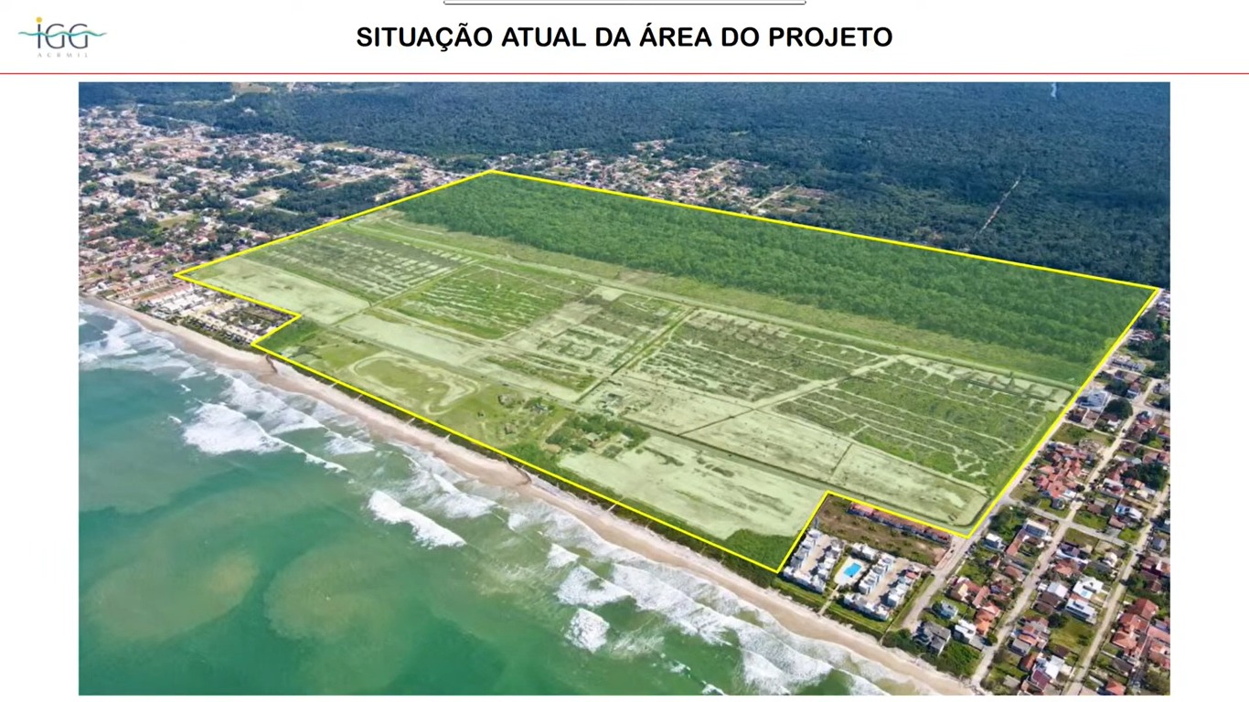 Pela IGG, empresa proprietária da área e responsável pelo empreendimento, pronunciaram-se Rubens Geraldo Gunther e Harry Louis Franke. Rubens fez uma introdução sobre assunto, citando que o objetivo do encontro era dar satisfação à população de Itapoá sobre todo o trabalho desenvolvido nos mais de dez anos de projeto, que teve início em 2011 e agora está na fase conclusiva, com as emissões das matrículas imobiliárias previstas para ocorrerem ainda neste mês de abril. De acordo com o Rubens, esse é um passo decisivo e a partir do qual poderão ser desenvolvidos a instalação da infraestrutura e eventuais negócios imobiliários que estarão autorizados a terem início. Foi também Rubens, o responsável por contar a história do empreendimento com Itapoá, que tem início pela década de 1950, quando seu pai Geraldo Mariano Gunther esteve entre os desbravadores da cidade. No encerramento de sua fala, Rubens também citou os compromissos do empreendimento com a comunidade itapoaense, sempre apoiando projetos de entretenimento, de esporte e de cultura, entre outros no âmbito do município.
