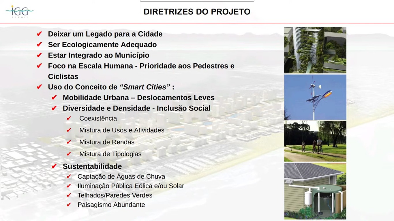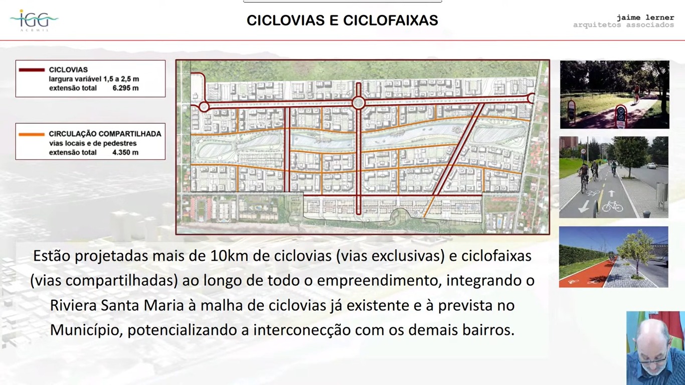 Dando sequência à apresentação, Harry Louis Franke, um dos diretores do projeto e também representando a IGG, abordou as diretrizes do Projeto, apresentando um breve histórico do mesmo e mostrando uma imagem de como ele se encontra atualmente. Além disso, Harry citou os diferenciais da Riviera Santa Maria, deixando claro que não se trata de um condomínio fechado, como muitos erroneamente pensam, já que as ruas que atravessam a Riviera continuarão sendo públicas. De acordo com Harry, o projeto é, na verdade, um bairro planejado aberto. Ao fim de sua fala, ele ainda comentou sobre o sistema viário interno, os marcos urbanísticos e a rede de infraestrutura urbana da Riviera Santa Maria.