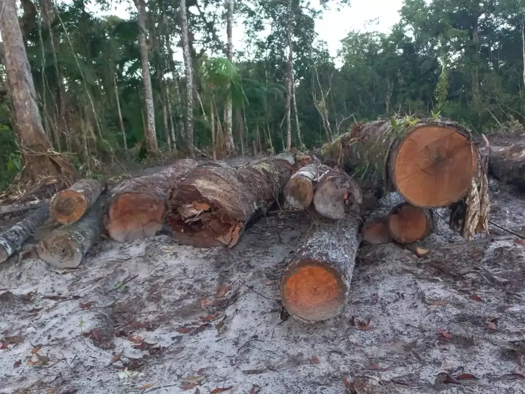 Essa estrutura, construída com árvores nativas, foi demolida pela equipe policial com o intuito de interromper as atividades criminosas relacionadas ao meio ambiente na região.