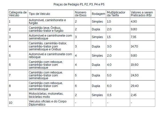 Confira, abaixo, como fica a tarifa por tipo de veículo a partir do dia 04 de agosto: