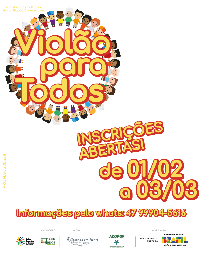 Já o projeto Violão para Todos, que é uma porta aberta para iniciação no violão, está em sua quinta edição. São oferecidas aulas gratuitas em turmas de até cinco alunos. As aulas ocorrem em Itapema do Norte e no Pontal da Figueira. Para participar, o interessado precisar ter acima de oito anos de idade, estar alfabetizado; ter o instrumento violão; e disponibilidade de horário pra frequentar as aulas.