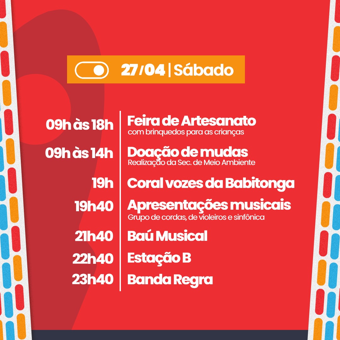 No sábado, dia 27 de abril, será a vez das bandas e demais atrações locais se apresentarem, constando na programação divulgada pela Prefeitura de Itapoá: Feira de Artesanato (das 9h às 18h); Doação de Mudas (9h às 14h); Coral Vozes da Babitonga (19h); Apresentações Musicais (19H40); Baú Musical (21h40); Estação B (22h40); Banda Negra (23h40).