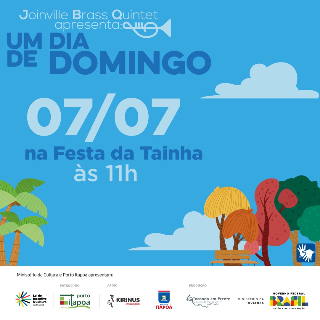 Neste domingo, dia 07 de julho, ao meio dia, será a vez do projeto “Um Dia de Domingo” se apresentar nesta edição da tradicional festa. Trata-se de um quinteto de metais e bateria que busca ampliar o gosto e o conhecimento musical do público. Seguindo o formato “flash moby”, no qual os músicos entram em cena andando em meio aos presentes, a ideia é aproximar esse público do repertório. A familiaridade com os temas musicais e a lembrança cinematográfica promovem ainda mais a aproximação do público com um formato que não é tão presente no cotidiano das pessoas, principalmente em cidades menores, longe dos grandes centros.