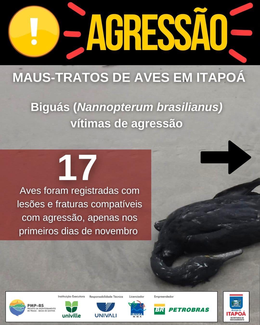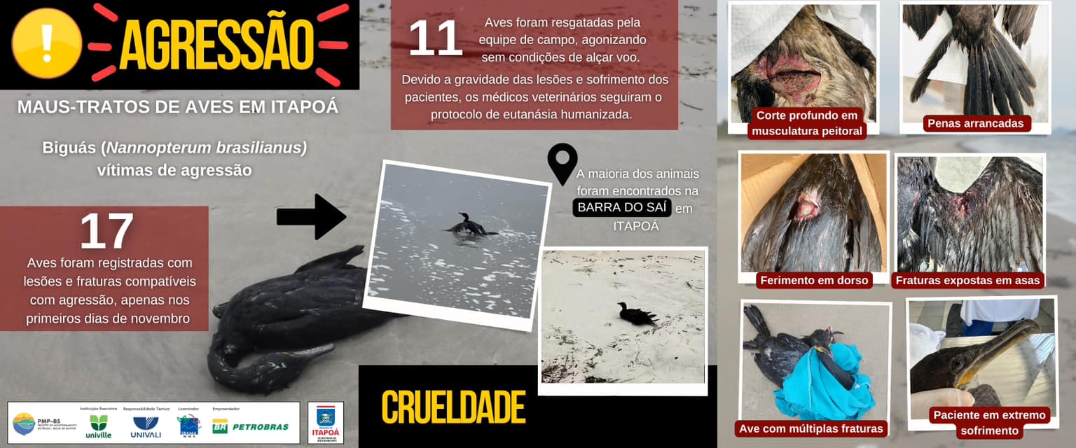 Nessa quinta-feira, dia 07 de novembro, o PMP-BS/Univille (Projeto de Monitoramento de Praias da Bacia de Santos) emitiu um alerta para o município de Itapoá. De acordo com a mensagem, o responsável pelo trecho 5 (litoral norte de Santa Catarina) do projeto vem registrando, recentemente, diversas aves conhecidas como biguás (Nannopterum brasilianus) com marcas que sugerem agressão. “Apenas nos primeiros dias de novembro, foram mais de 15 animais recolhidos na região da Barra do Saí em Itapoá”, explica a nota.