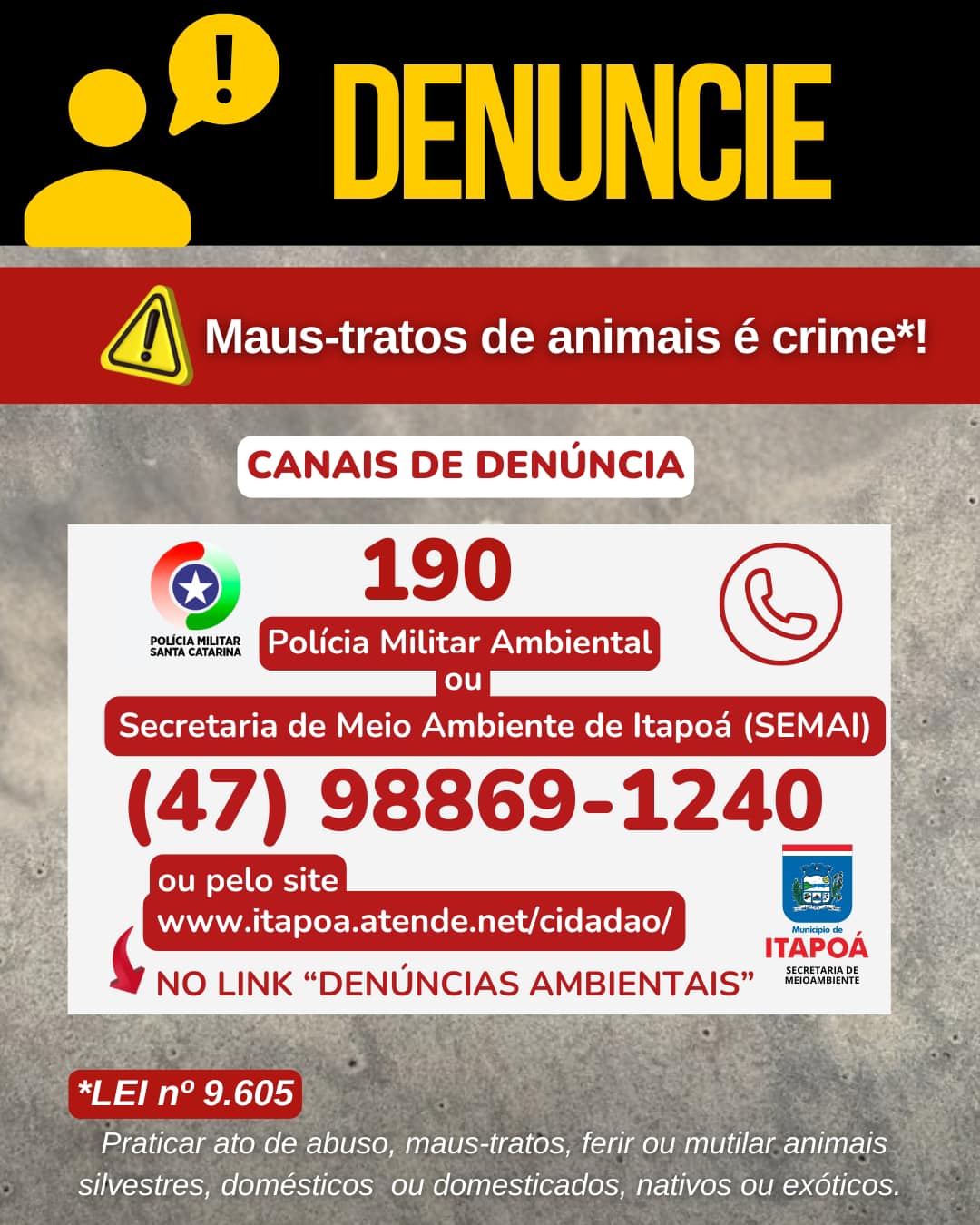 Por fim, o alerta do PMP-BS/Univille lembra que maltratar animais – domésticos ou selvagens – é crime ambiental. O papel da sociedade nesses casos é denunciar pelos canais existentes para tal, que são o telefone 190 da PM (que abrange também a Polícia Militar Ambiental), a Secretaria Municipal de Meio Ambiente de Itapoá pelo telefone (47) 98869-1240 ou site itapoa.atende.net/cidadao, no link “Denúncias Ambientais”.