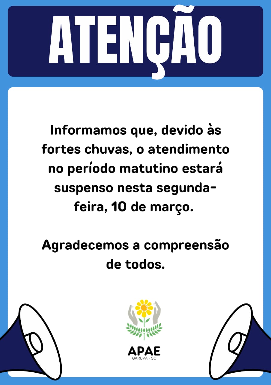 Em nota publicada em suas redes sociais logo após a chuva cessar, a Prefeitura de Garuva informou que por questão de segurança e devido aos alagamentos que atingiram algumas escolas, as aulas da rede municipal de ensino foram suspensas nesta segunda-feira, dia 10 de março. “As faltas serão justificadas e os conteúdos repostos, garantindo que os alunos não tenham prejuízos pedagógicos”, garantiu. “Contamos com a compreensão de todos e reforçamos a importância de cuidarmos da segurança de nossos estudantes e profissionais, completou a nota da Prefeitura, que concluiu “a Defesa Civil e o Corpo de Bombeiros estão em alerta devido às condições climáticas. Em caso de urgência, ligue 199 (Defesa Civil) ou 193 (Bombeiros)”. Quem também suspendeu seus atendimentos no período matutino desta segunda (10/03), por motivo das fortes chuvas, foi a APAE de Garuva.