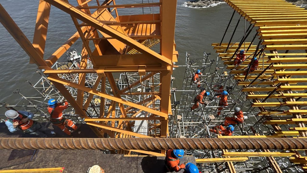 Essa etapa se soma a tudo o que está em andamento. Ao longo do último mês de fevereiro (2025), teve continuidade a execução das estacas do chamado trecho pré-moldado, todo aquele que não envolve a parte estaiada, envolvendo atividades de cravação, escavação e concretagem, além da fabricação e lançamento das vigas longarinas, que formam a base por onde passará a via. Foi finalizada também a concretagem dos blocos e pilares das torres principais do trecho estaiado.