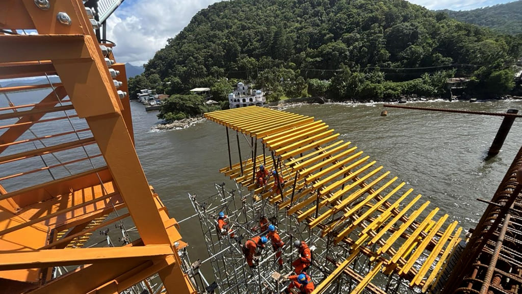 Neste momento, está em execução, a montagem da estrutura temporária que serve para sustentar as formas de concreto durante a construção, etapa chamada de cimbramento. Em paralelo, está sendo construída a aduela de partida, peça que permite a construção de vãos sem a necessidade de escoramento. Os detalhes podem ser conferidos no vídeo produzido pelo consórcio que executa a obra.
