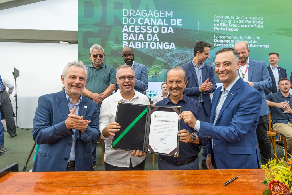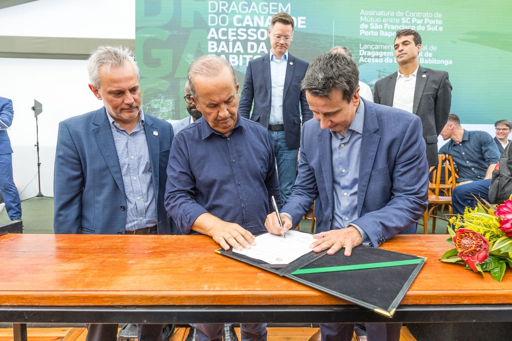 Foi realizada na tarde desta sexta-feira, dia 21 de março, a assinatura do contrato entre os portos de São Francisco do Sul e Itapoá para a dragagem e o aprofundamento do canal de acesso à Baía da Babitonga. Trata-se de um marco histórico, caracterizado por dois aspectos inéditos e inovadores. Pela primeira vez no Brasil, um porto público firma parceria com um porto privado para a realização de uma obra desta natureza. Além disso, parte dos sedimentos retirados do mar será destinada ao engordamento de uma praia, em Itapoá.
