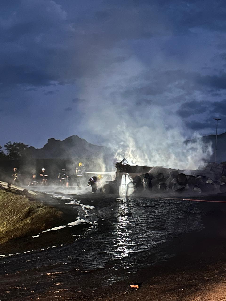 Em nota publicada nas redes sociais, o Corpo de Bombeiros de Garuva afirmou que “acionados para atender um incêndio de grandes proporções envolvendo uma carreta acoplada a um trem, carregada com resina de pinos, às margens da BR-101, no km 11. O Corpo de Bombeiros Militar de Garuva deslocou imediatamente o trem de socorro, atuando em conjunto com os Bombeiros Voluntários de Joinville. A carga altamente inflamável exigiu técnicas específicas de combate ao fogo e trabalho coordenado entre as equipes para evitar que as chamas se alastrassem e causassem danos ainda maiores. Mais uma vez, a integração entre forças operacionais fez a diferença no controle da ocorrência.”