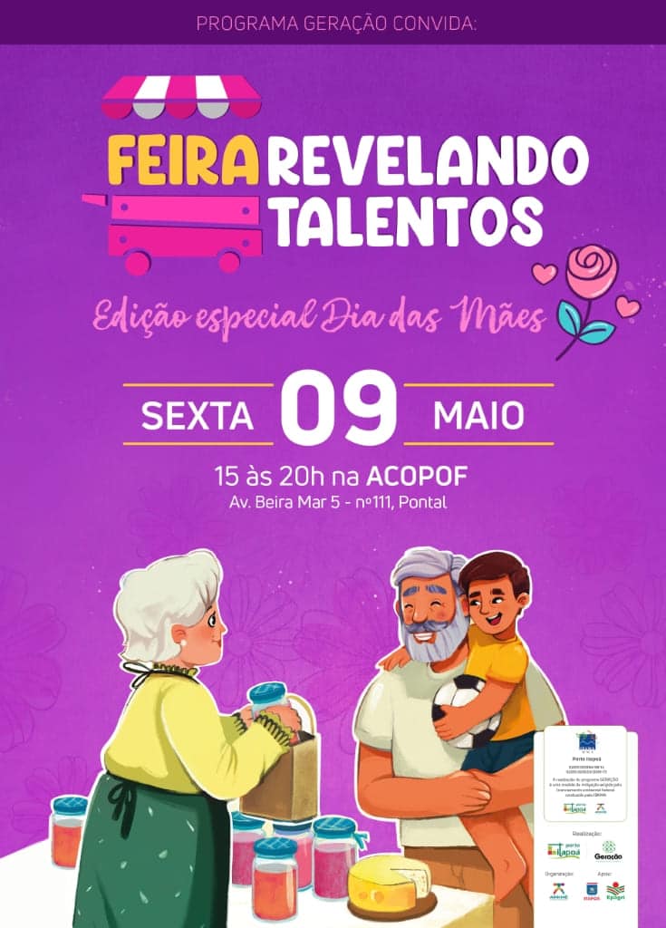 Nesta sexta-feira, dia 9 de maio, ocorre mais uma edição da tradicional “Feira Revelando Talentos”. Trata-se de uma edição especial em celebração ao Dia das Mães. O evento acontece das 15h às 20h, na sede da Associação Comunitária do Pontal e Figueira (ACOPOF), situada na Avenida Beira Mar 5, nº 111, no bairro Pontal.