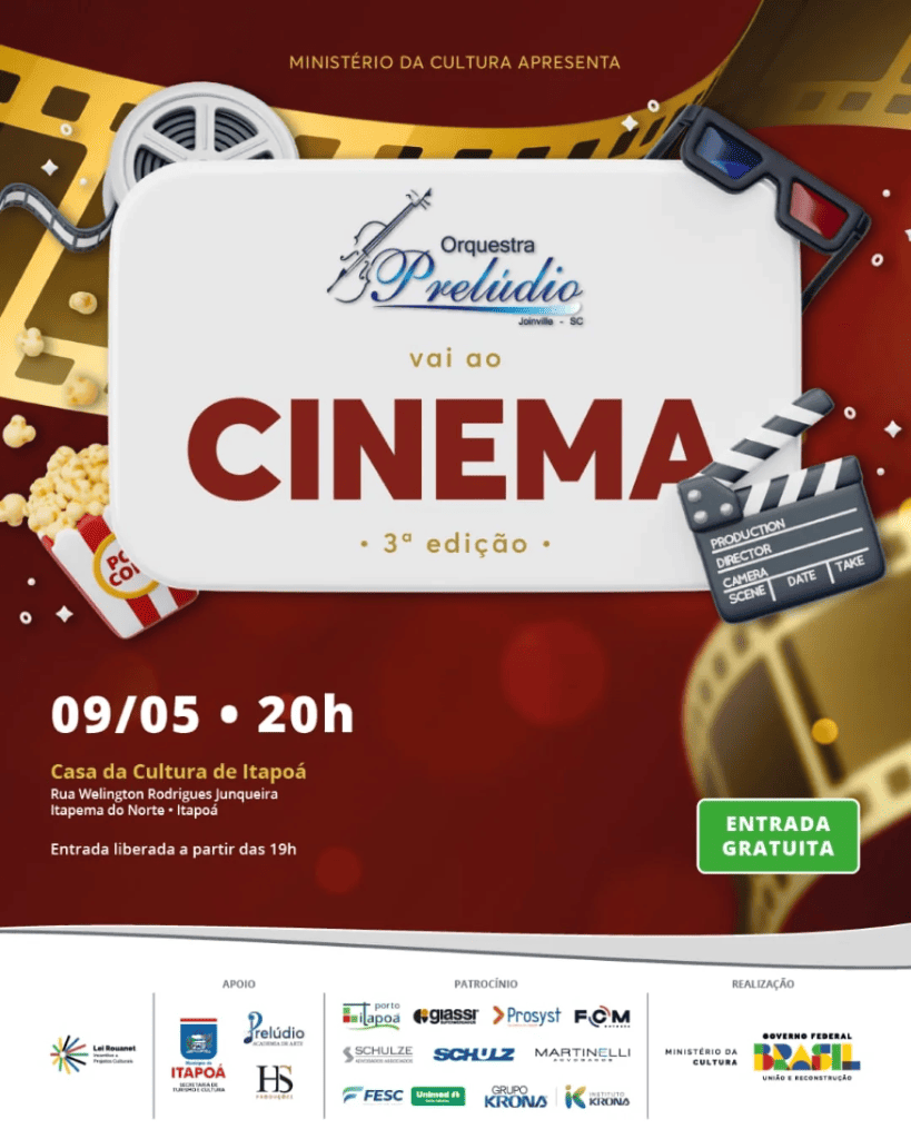 Itapoá será palco de um espetáculo inesquecível nesta sexta-feira, dia 9 de maio, a partir das 20h, na Casa da Cultura. A cidade receberá a abertura da temporada de concertos 2025 da renomada Orquestra Prelúdio, com a terceira edição do projeto “Orquestra Prelúdio vai ao Cinema”. A entrada é gratuita e o acesso ao local será liberado a partir das 19h – o público é orientado a chegar mais cedo para garantir lugar.