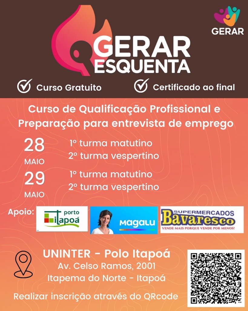 Com o objetivo de promover a inclusão social e ampliar as oportunidades de acesso ao mercado de trabalho, o Porto Itapoá e a instituição GERAR (Geração de Emprego, Renda e Apoio ao Desenvolvimento Regional) promovem em Itapoá, o curso gratuito “Esquenta GERAR – Curso de Qualificação Profissional e Preparação para Entrevista de Emprego”.