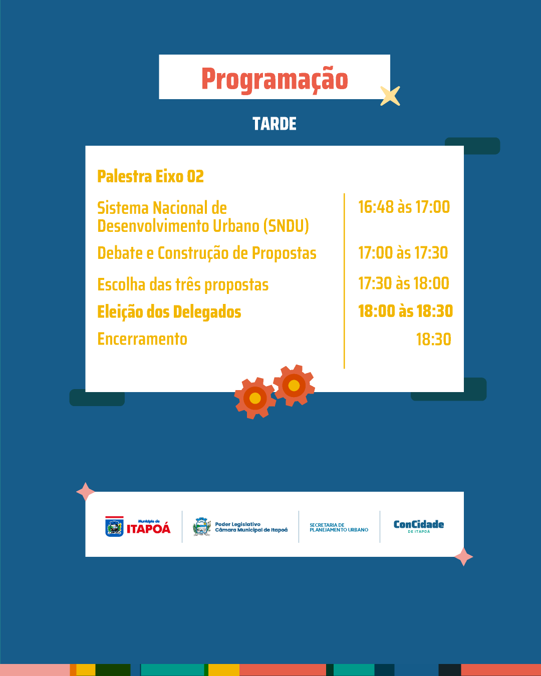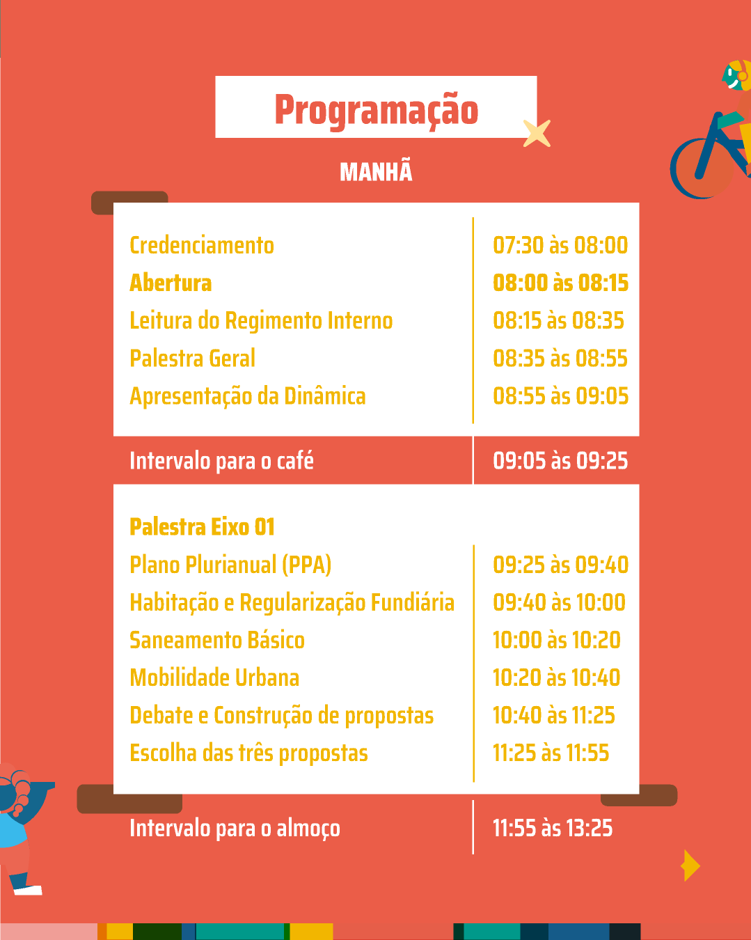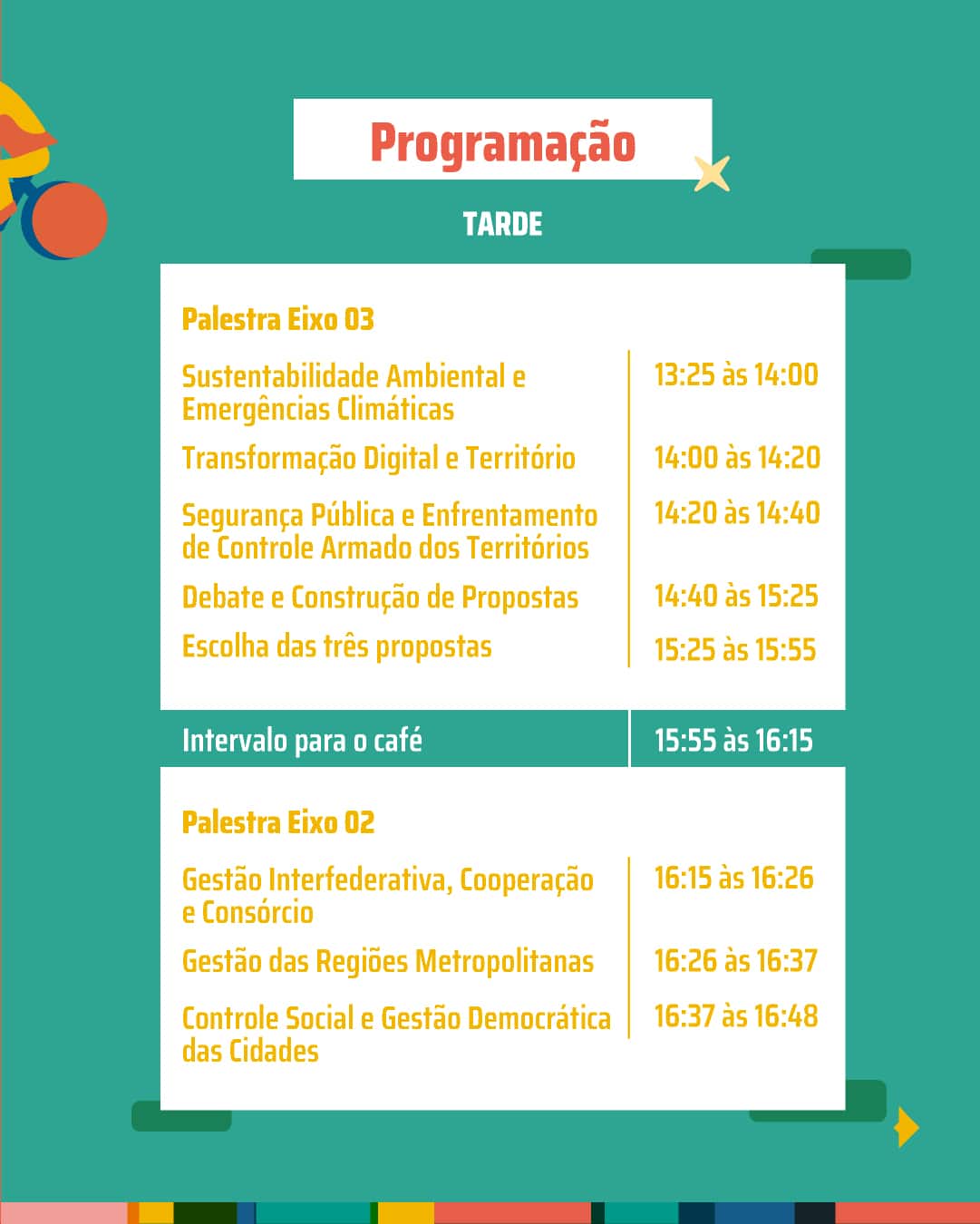 O evento contará com uma intensa programação durante todo o dia, com palestras temáticas, construção de propostas e eleição de delegados. Os temas são divididos em três eixos principais: